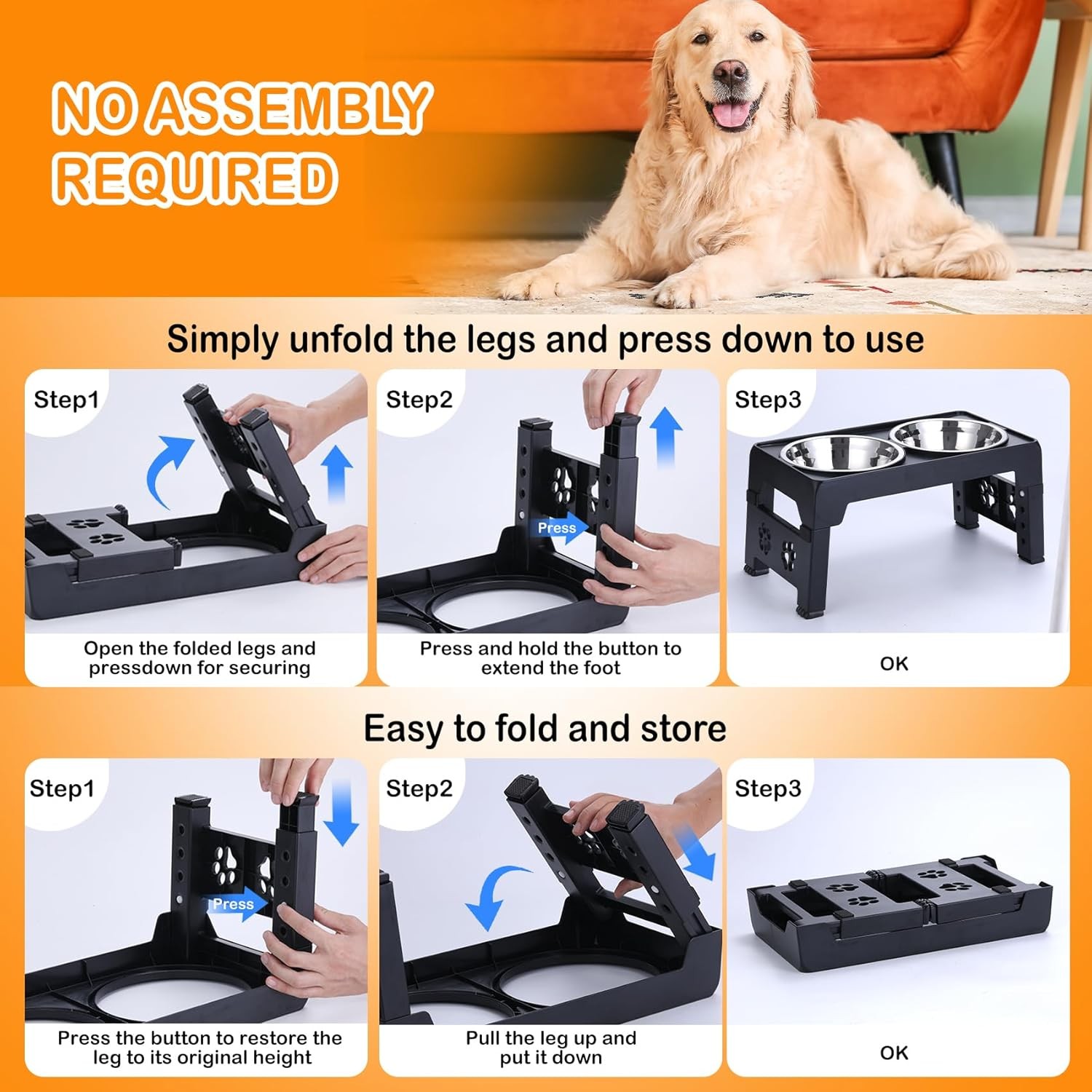 High Quality & Durable: The dog feeding & watering supplies adopts high-quality ABS materials. Adjustable raised dog bowl stand reaches the ideal height meets small medium large dogs in order to reduce strain on their neck and back