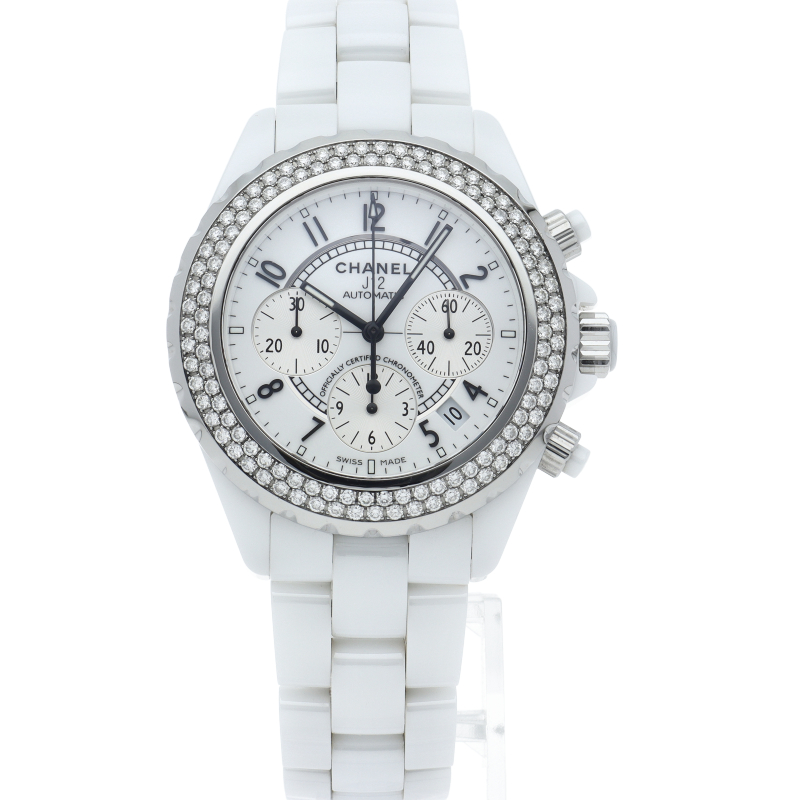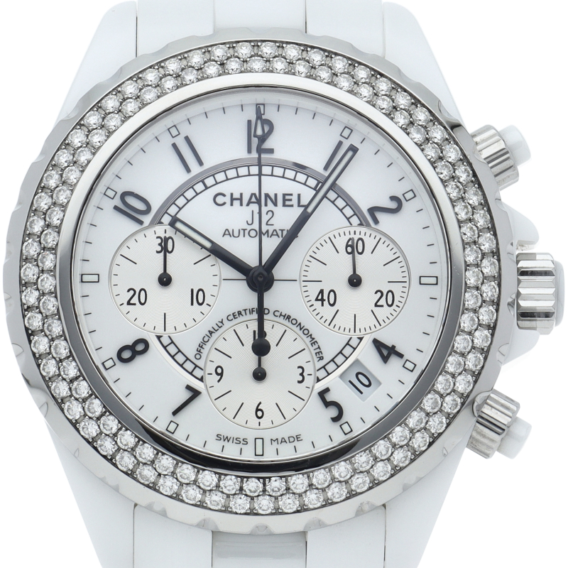 | Chanel's popular flagship watch "J12". This watch successfully combines ceramic, a different material that is scratch-resistant and has a unique luster, with the design. The bezel is luxuriously decorated with double diamonds. Equipped with a chronograph. |