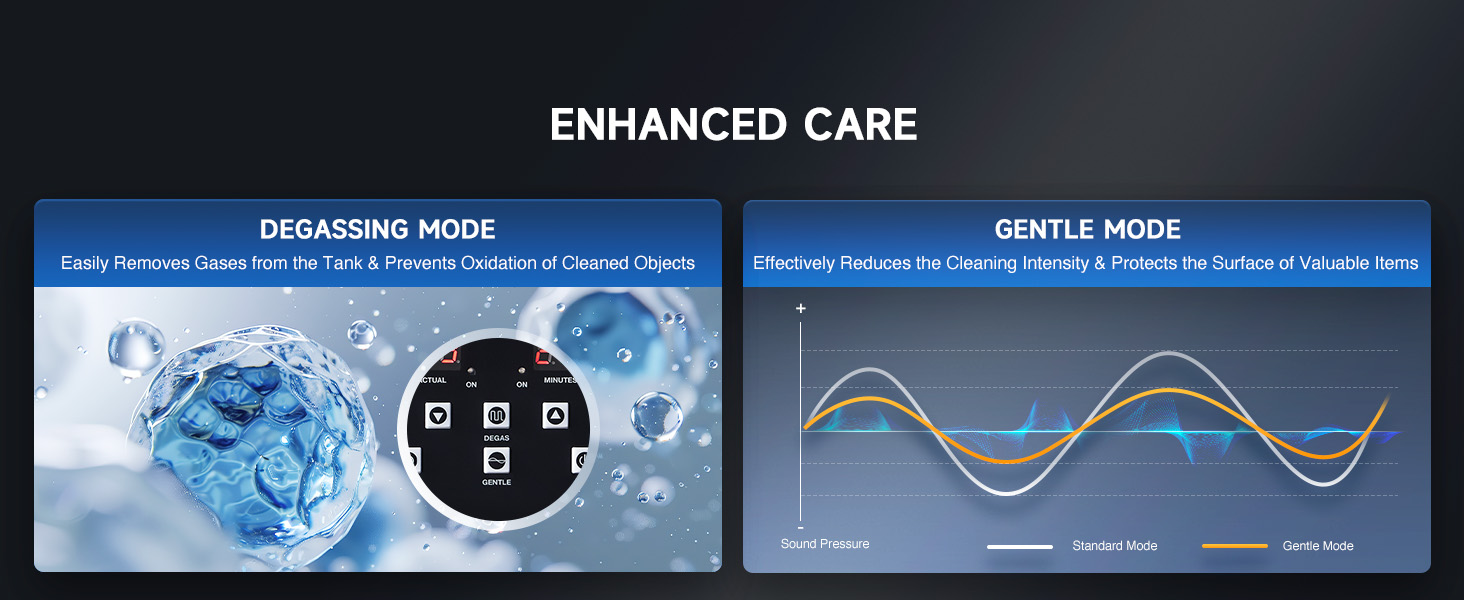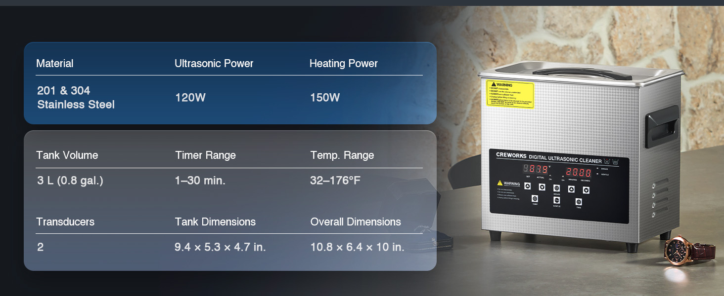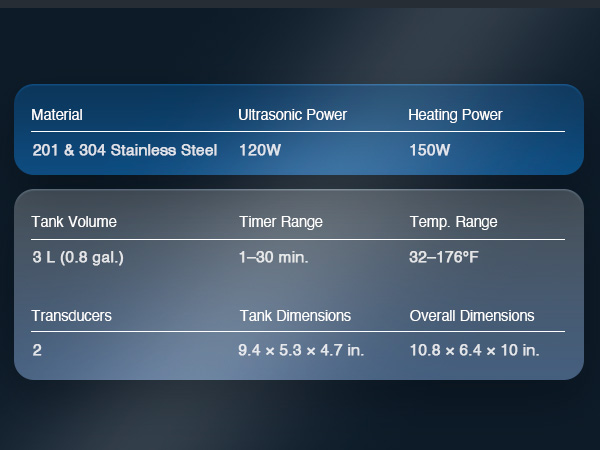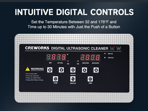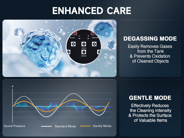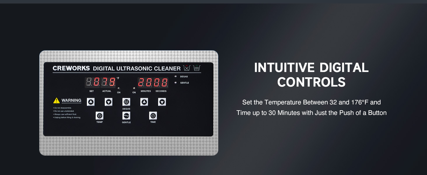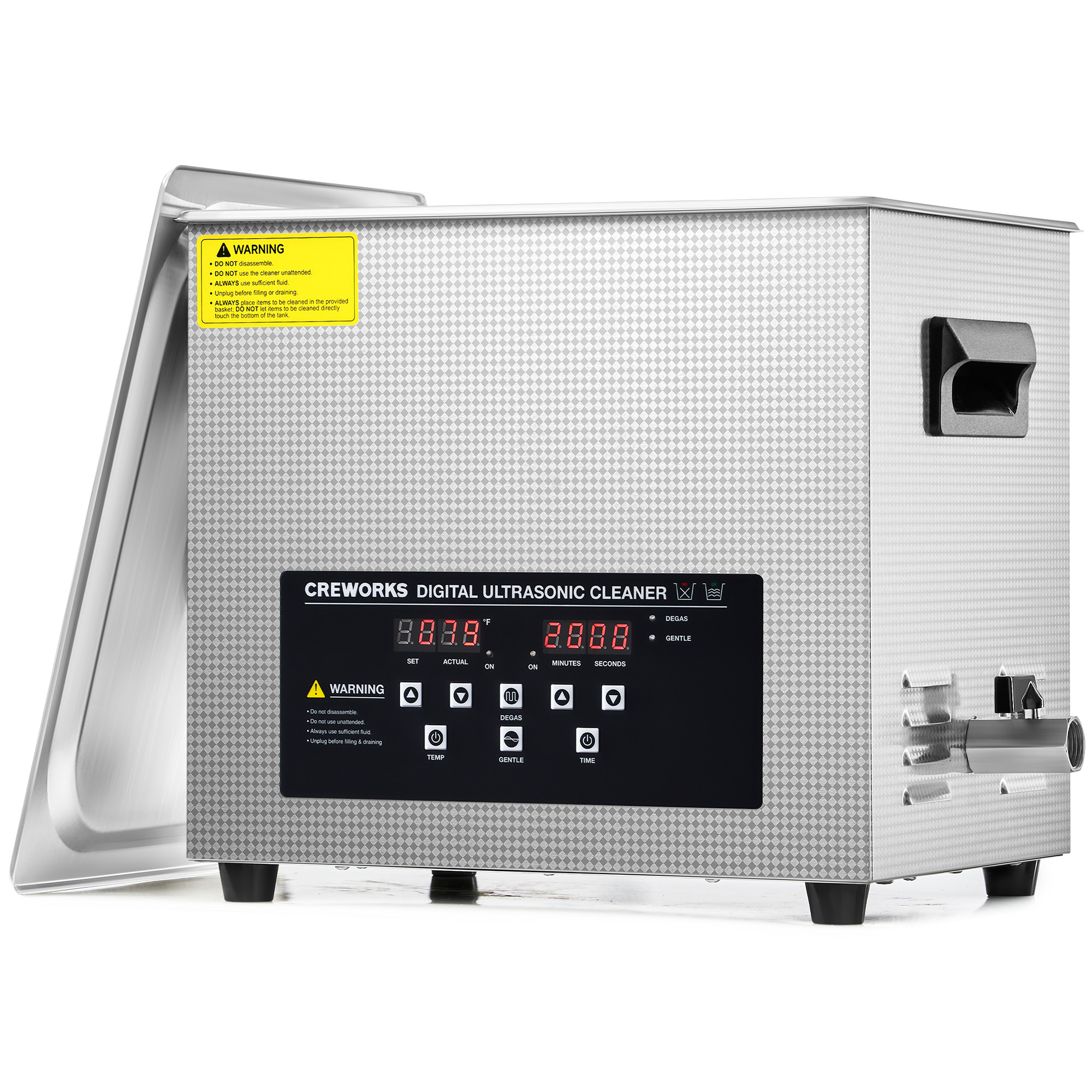 This industrial-strength ultrasonic cleaner is built to outperform and outlast the competition with its reinforced stainless steel tank walls, perfectly gentle yet thorough 40kHz sound wave cavitation, and intuitive control panel. The degas and gentle cleaning modes are specifically engineered to protect your delicate and valuable items.