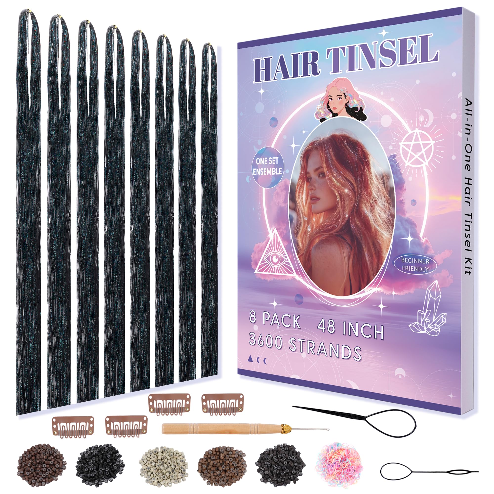 - Heat Resistant Hair Tinsel Material: Hair Tinsel Heat Resistant is made of premium heat-resistant polyester fiber hair tinsel. With a Length of 48 Inches(24inch folded length), Plenty of length to cut as you need. The tinsel hair extensions kit is the good option for hair fashion and the perfect hair accessories gift for girls and kids, cute for girls of all ages