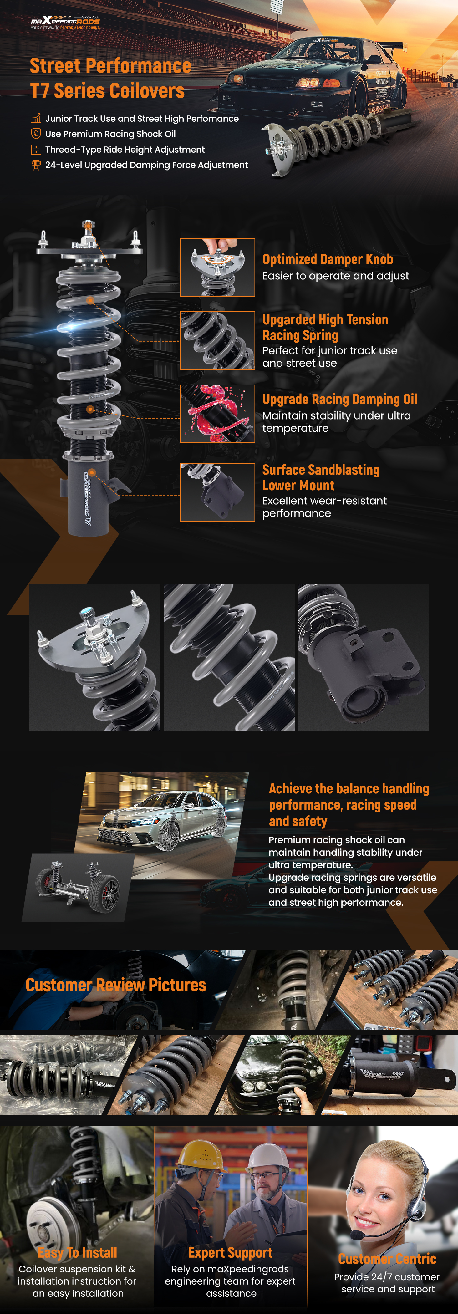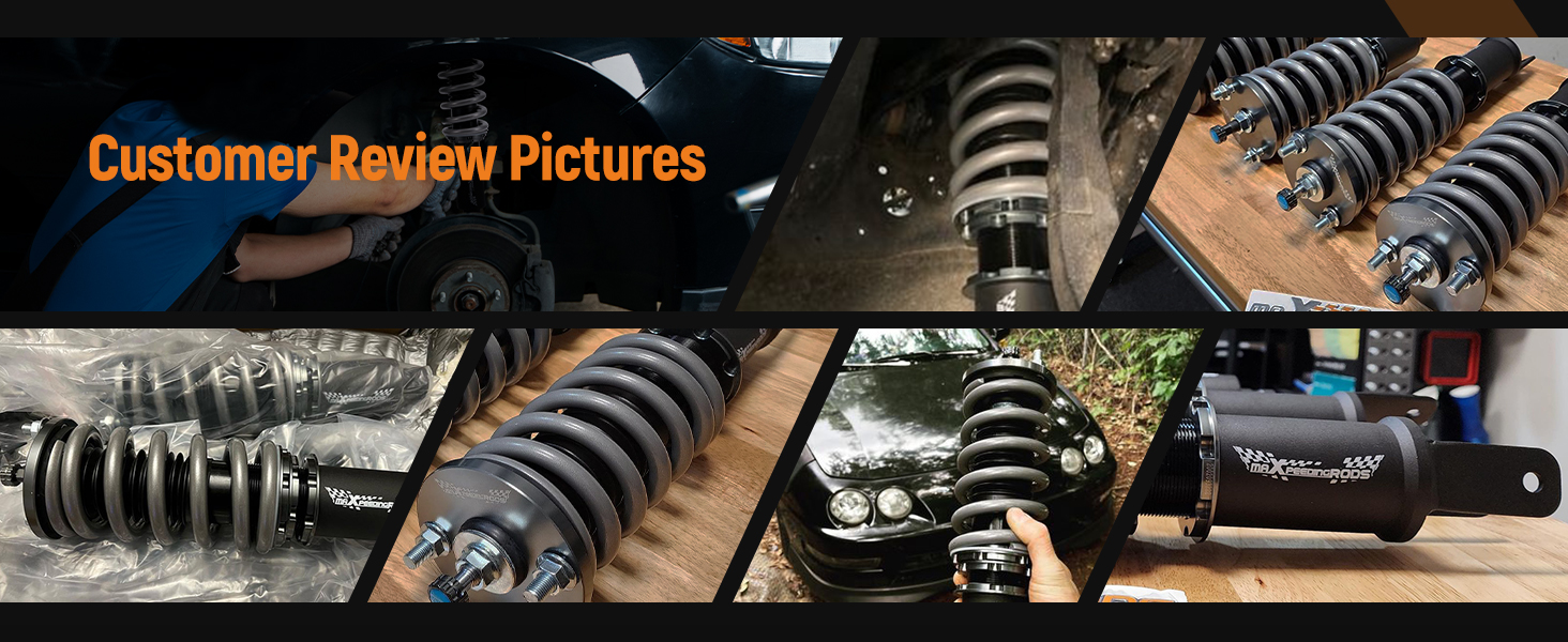 MaXpeedingrods T7 coil-overs are designed for daily street use and Junior track use. It features racing damping oil, upgraded racing springs, ride height adjustment, and adjustable camber plates( applicable for some vehicles), which offers you a lowered stance and enhanced handling.