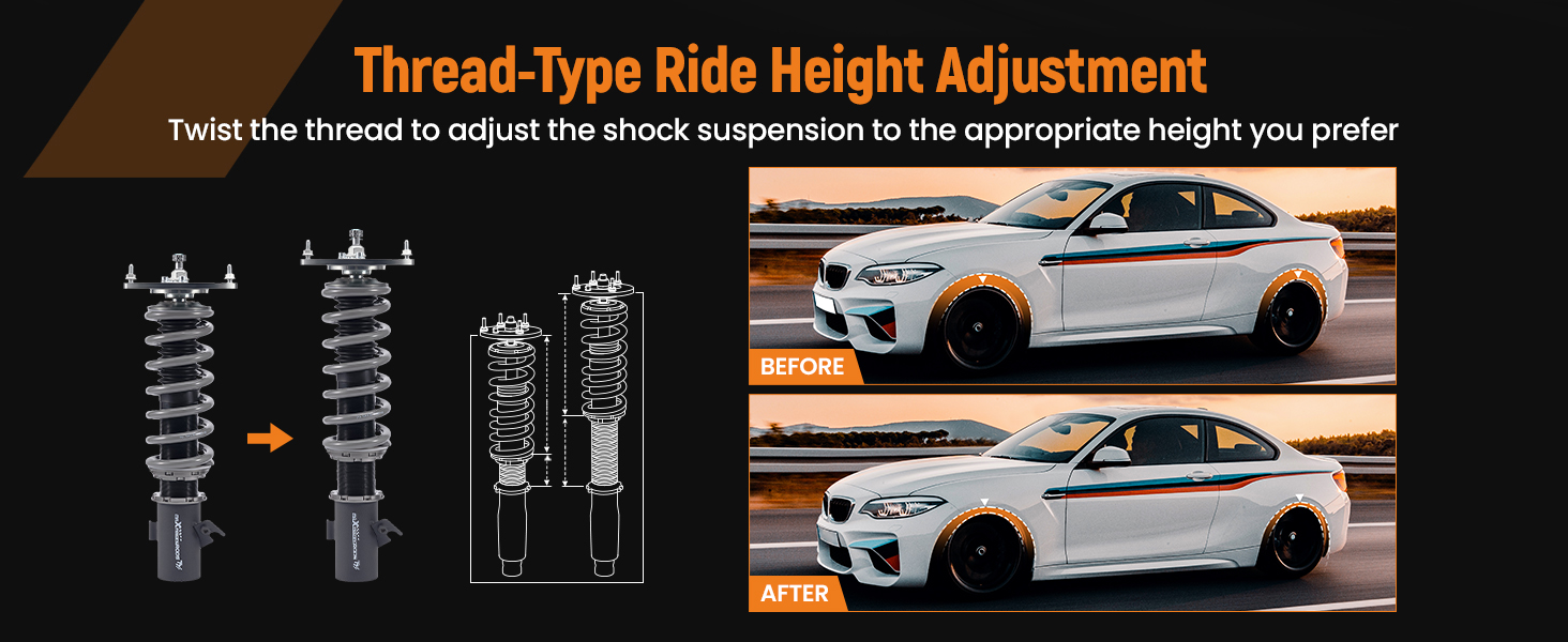 - Lowered height adjustment from 1" - 3" (depending on vehicle models) which adds a more aggressive stance and a lower center of gravity.