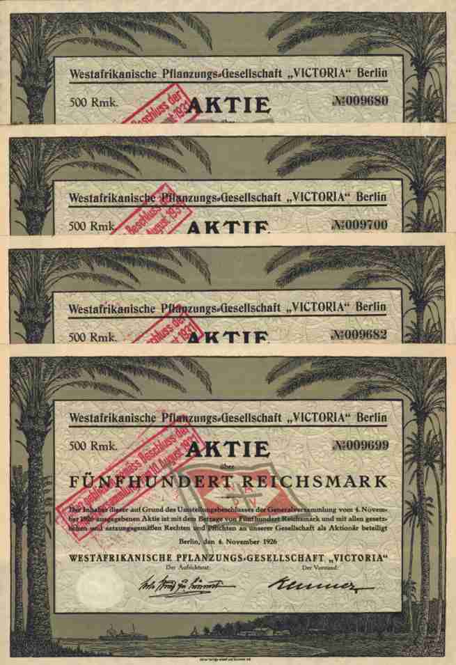 4 er LOT - ungelocht nicht aus der Reichsbank !! Dekorative Kolonial - Aktie mit Eisenbahn !!!! 4 Originalaktien -- siehe Archivbild -- zu je 500 Reichsmark der Westafrikanische Pflanzungs Gesellschaft "Victoria" (WAPV), Berlin vom 4. November 1926. Gegründet am 21.01.1897; eingetragen 02.10.1897. Erwerb und Verwertung von Grundbesitz in Übersee, sowie Betrieb von Land und Plantagenwirtschaft. Die Gesellschaft übernahm zusammen 10 745 ha. Grundbesitz von Dr. Max Esser, Berlin und dem Bergwerksbesitzer Sholto Douglas, Berlin. Das Gelände lag in den deutschen Schutzgebieten von Kamerun den Kamerunbergen bei der kleinen Hafenstadt Victoria. Die Victoria-Pflanzung bei Bota-Victoria, die Prinz Alfred-Pflanzung bei Missellele-Tiko und die Bimbia-Mabeta-Pflanzung waren die Herzstücke der WAPV. Es wurden vorwiegend Kakao und Ölpalmkulturen bestellt. Ab 1910 wurden auch Kautschuk und Plantenkulturen angepflanzt. Zu dieser Zeit baute die Gesellschaft eine eigene Kleinbahn mit 60 cm Spurweite. Die Bahn hatte eine Länge von 66 Kilometer und verband den Küstenort Victoria mit dem Hauptort Soppo. 1913 wurden 53 europäische Angestellte sowie 2643 Einheimische Arbeiter beschäftigt. Nach dem Ersten Weltkrieg wurde die WAPV enteignet. 1925 konnte sie bei einer Auktion in London einen Teil des früheren Besitzes zurückerwerben, setzte auf Kultivierung von Bananen und führte den Teeanbau in Kamerun ein. Zu Beginn des Zweiten Weltkrieges wurde sie erneut enteignet. Die Verwaltung übernahm die 1947 gegründete Cameroons Development Corporation (CDC) mit Sitz in Victoria. Die Gesellschaft erhielt seitens des Reichs Schadenersatz um damit einen Neuaufbau in anderen Überseegebieten zu beginnen. Vorstand um 1926: Wilh. Kemmer. Hochkarätiger Aufsichtsrat: Alfred Prinz zu Löwenstein-Wertheim-Freudenberg - FS Unterschrift (Vors.) sowie, u.a. Bankier Carl Hagen, Berlin, Fürst Richard zu Sayn-Wittgenstein Berleburg, usw. Der Aktienmantel wurde von neuen Investoren genutzt. 1992 Umfirmierung in ABE Westafrikanische Pflanzungs-Gesellschaft "Victoria" AG und 1998 in Westafrikanische Pflanzungs-Gesellschaft "Victoria" AG i.K., Berlin und Butzbach. Die Gesellschaft beschäftigte sich mit Time-Share Objekten und einem Hotelprojekt in Brasilien, erlitt aber scheinbar Schiffbruch. Dekorativer Druck der Kölner Verlagsanstalt und Druckerei AG mit Palmenlandschaft , Dampfschiff vor der kleinen Hafenstadt Victoria. Sammlerfreundlicher Sonderpreis !