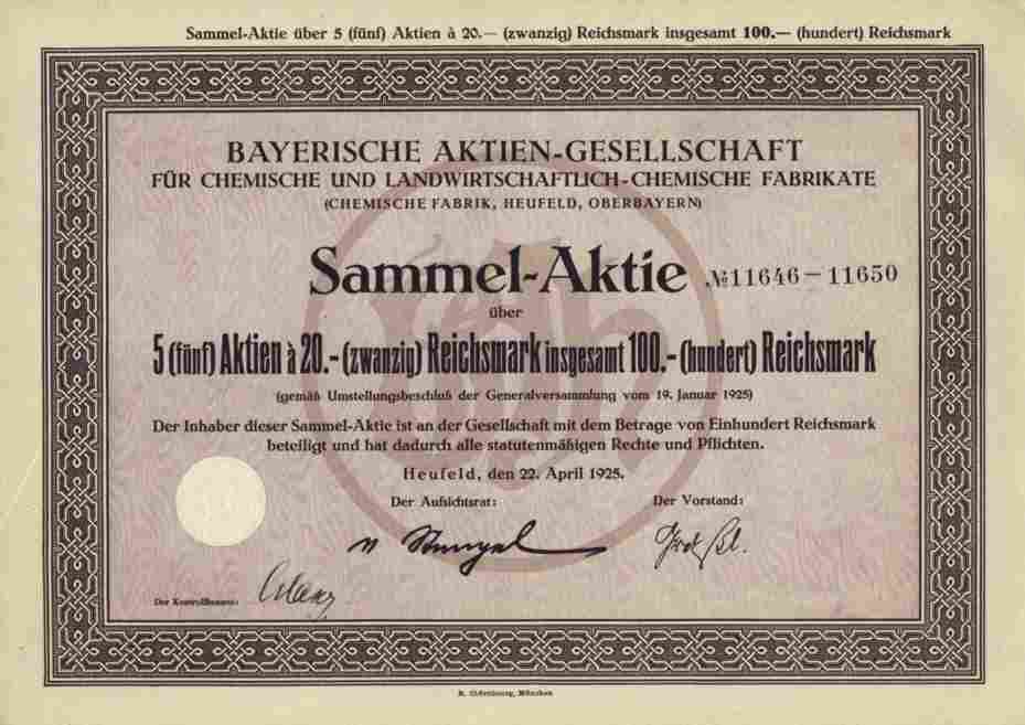 RARE Sammelaktie - nicht im Reichsbankbestand !! Orginal - Sammelaktie -- siehe Archivbild -- über 100 Reichsmark (5 x 20 RM) der Bayerische AG für chemische und landwirtschaftlich chemische Fabrikate, Heufeld Oberbayern, den 22. April 1925.Gewinnung von Bergwerkserzeugnissen und Herstellung von chemischen Produkten. Erzeugnisse: Bleicherde, synthetische Rohstoffe, Schwefelkohlenstoff, künstliche Düngemittel, Superphosphat, Schwefelsäure, Akkumulatorensäure, Sulfat, Salzsäure. Gegründet am 19.11.1857 unter der Firma: Bayerische AG für chemische und landwirtschaftlich-chemische Fabrikate in Heufeld. Durch Hauptversammlungsbeschluß vom 20.2.1941 Änderung in: Süd-Chemie AG nach Aufnahme der Vereinigte Bleicherde Fabriken AG unter Sitzverlegung nach München. Beteiligungen um 1945: 1. Bleichton-Gesellschaft mbH, München. 2. Salzburgische Bergwerks- und Hütten-AG, Salzburg. 3. Kohle- und Erde-Verwertungs-GmbH, Deggendorf. 4. Bankhaus Seiler & Co., München. 5. Wirtschaftliche Studiengesellschaft mbH, München. Großaktionär um 1945: Romosten chem. GmbH (ca. 25 %). Kernkompetenz ist heute die Oberflächenbehandlung anorganischer Materialien. Kernkompetenz ist die Oberflächenbehandlung anorganischer Materialien, mit den beiden Unternehmensbereichen Adsorbentien und Katalysatoren. Im Februar 2011 Übernahme durch den Schweizer Spezialchemiekonzern Clariant. Firmenemblem geprägt im Trockensiegel. Sammlerfreundlicher Sonderpreis !
