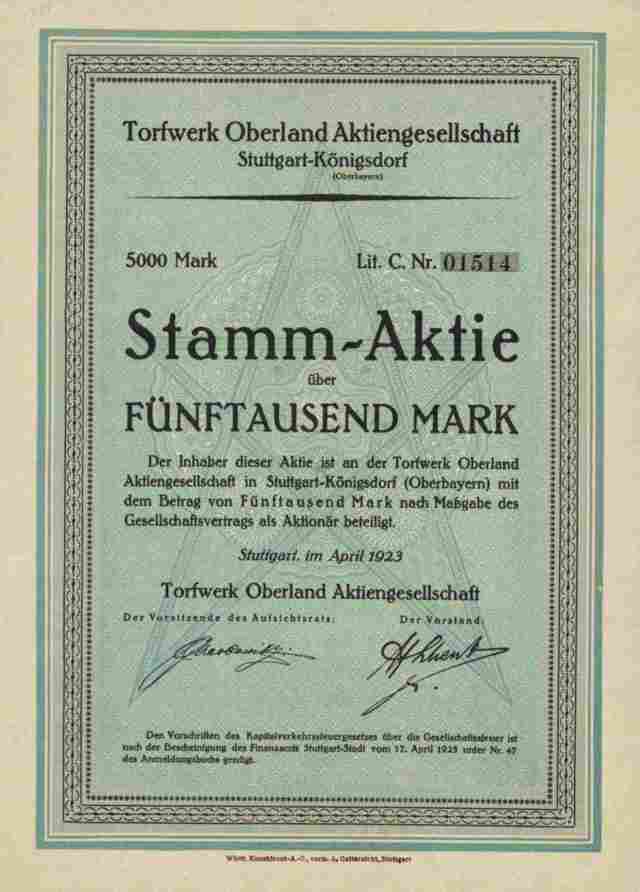 Torfaktie mit rarem Nennwert - ungelocht - mit kompletten Kuponbogen ### KEIN - Barov (Reichsbankbestand) ### Orginalaktie Lit. C - siehe Bild - Einzelstück - über 5000 Mark der Torfwerk Oberland AG, Stuttgart vom April 1923. Gründeraktie. Gründung am 9.4.1923. Gesellschaftszweck war die Erzeugung von Brenntorf, Torfstreu und Torfmull im bayerischen Oberland (Königsdorf liegt im Landkreis Bad Tölz - Wolfratshausen). Sitz der Verwaltung war München-Solln. Daß die AG ihren Der juristische Sitz war in Stuttgart eingetragen, da der Großindustrielle Robert Bosch der Haupteigner war. Bereits am 12.7.1924 wieder in Liquidation gegangen. Dekorativer Druck der Württembergischen Kunstdruck AG in Stuttgart mit großem Stern im Unterdruck. Kompletter Kuponbogen anbei. Sammlerfreundlicher Sonderpreis !