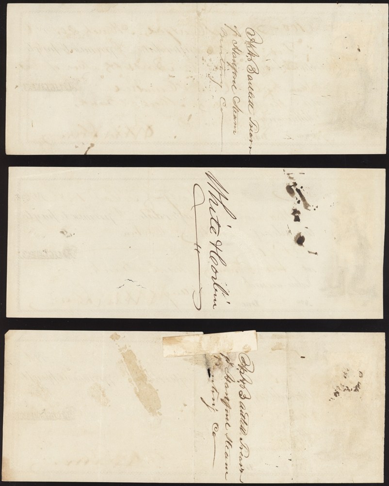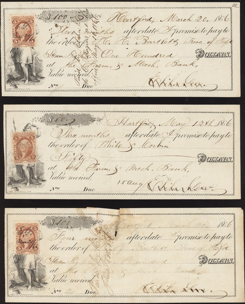 United States, 1866. Promissory Notes (3), Hartford, Conn, bearing Foreign Exchange $.05 revenue Scott R26c and $.05 Inland Exchange R27c, tied by manuscript cancels. F-VF.