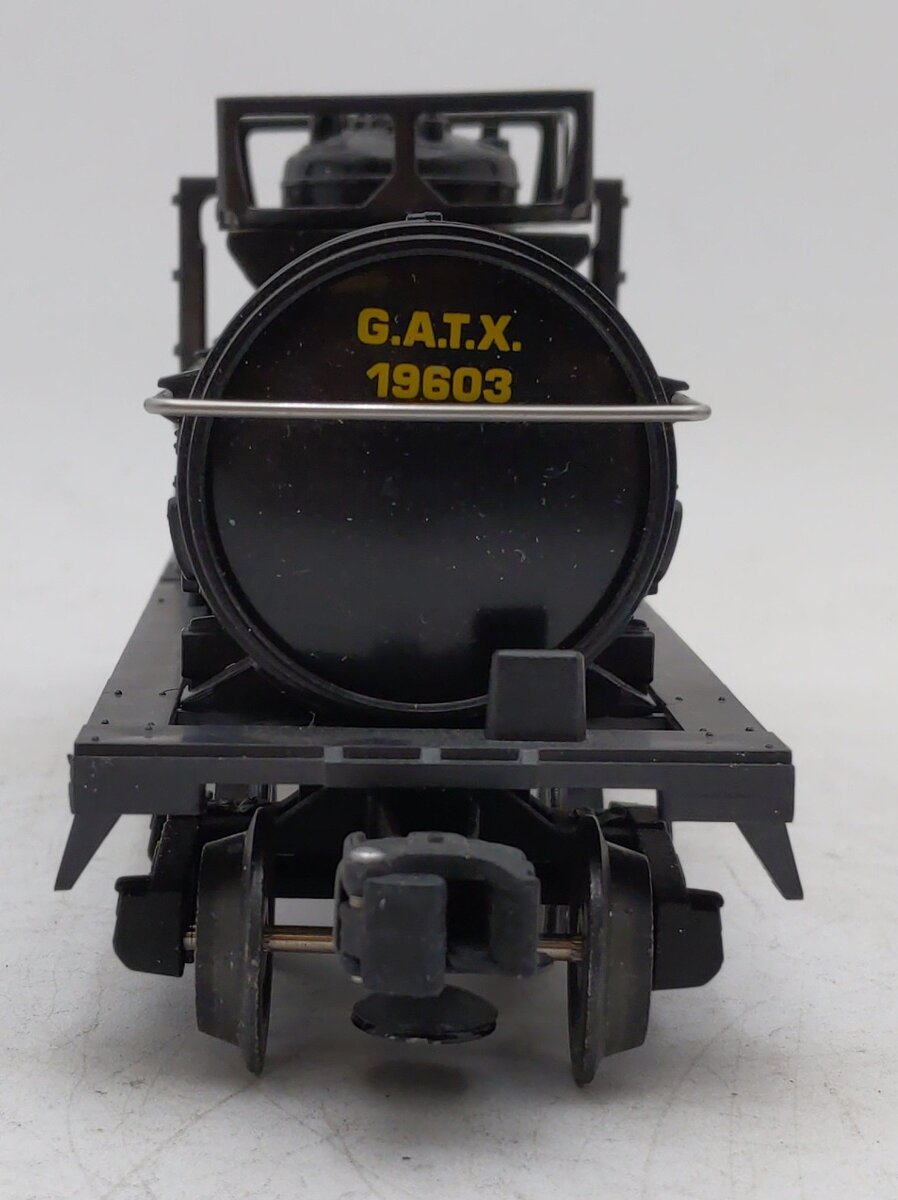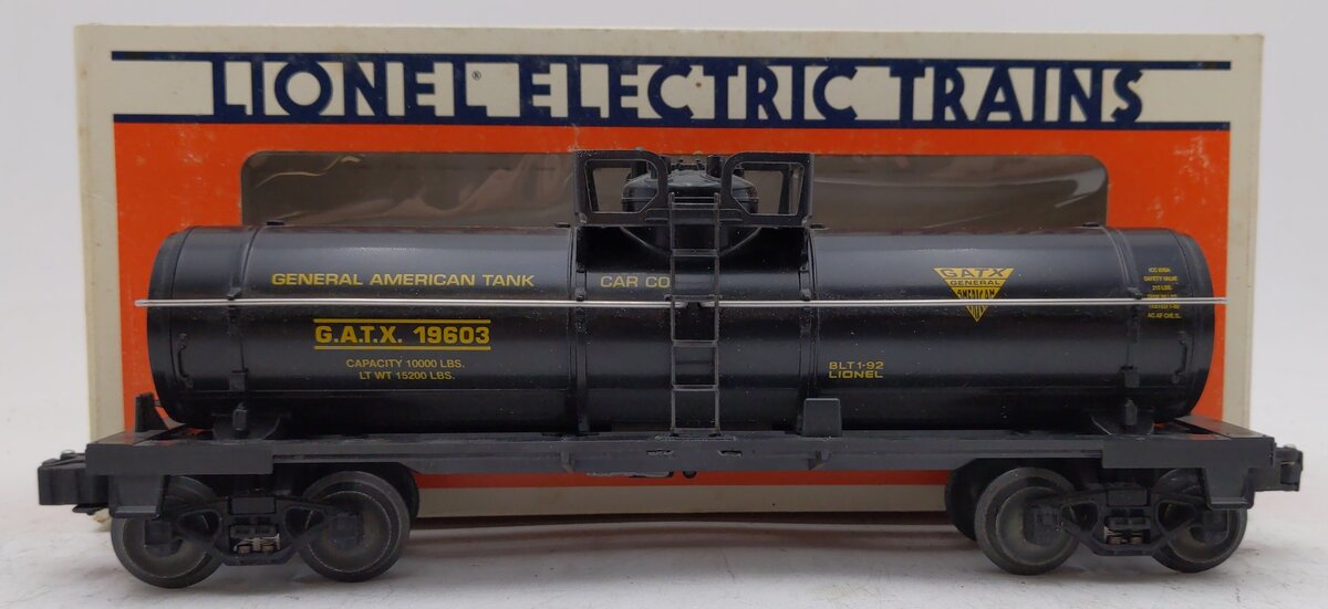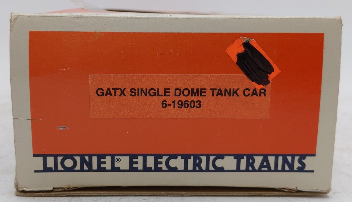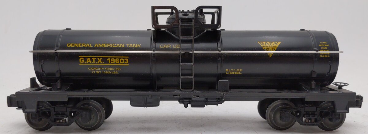 Here is a Lionel 6-19603 O Gauge GATX Single Dome Tank Car. This car features die-cast metal sprung trucks, die-cast metal operating knuckle couplers, and metal wheels and axles.