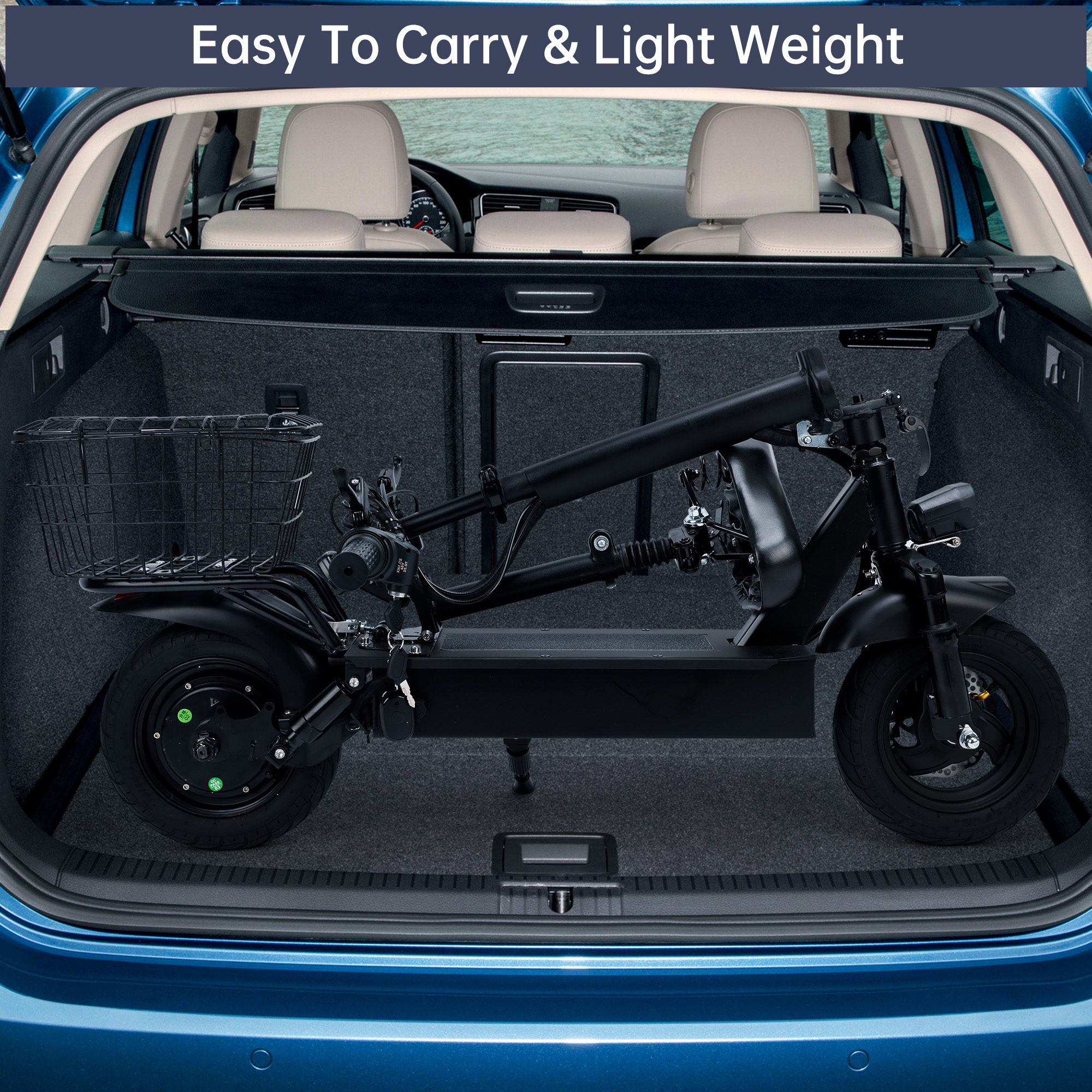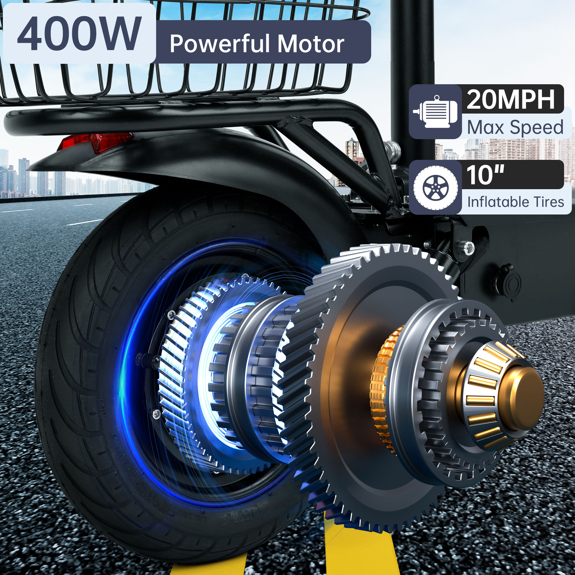 The scooter has a basket, which provides convenience for your usual commuting and quick trips, and the wide pedals increase the comfort of commuting