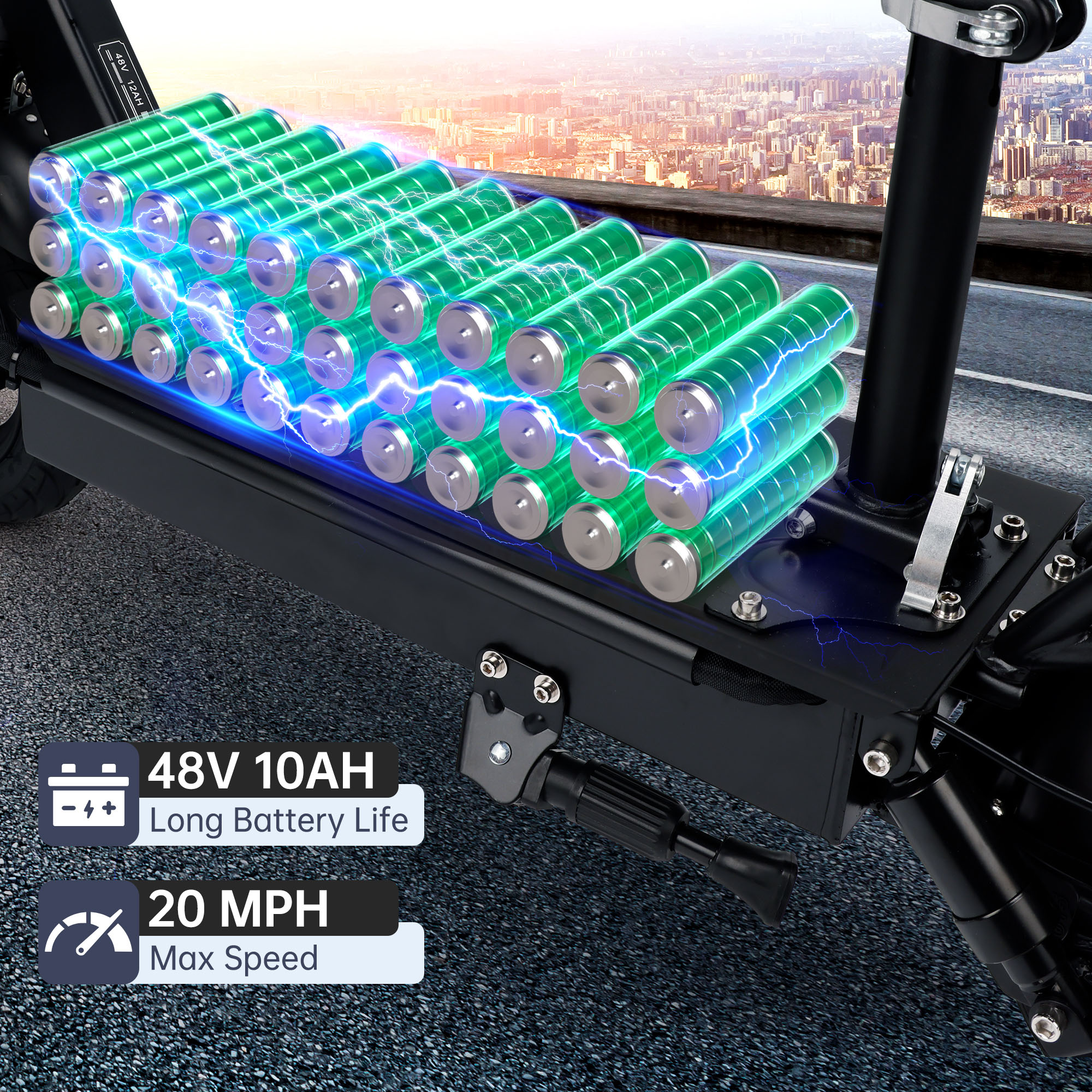 The scooter has a front drum brake and a rear disc brake system for reliable and efficient braking. 10-inch tires with a unique circular design provide excellent grip and stability even on rough terrain. At the same time, because of the foldable structure, it is easy to store and transport, which is very suitable for those who have limited space or those who need to go to work.