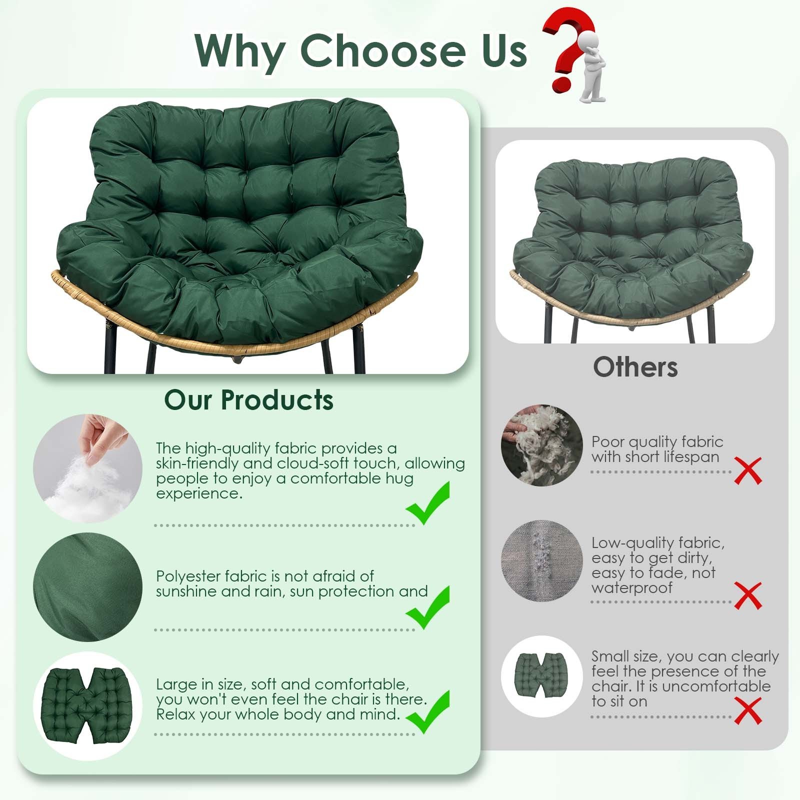 • Suitable for Various Chairs: Measuring 44 x 39 inches (120 x 100 cm), this Papasan chair cushion fits a wide range of seating types—from wicker glider chairs to hanging egg chairs. Available in multiple colors to match your outdoor or indoor decor.