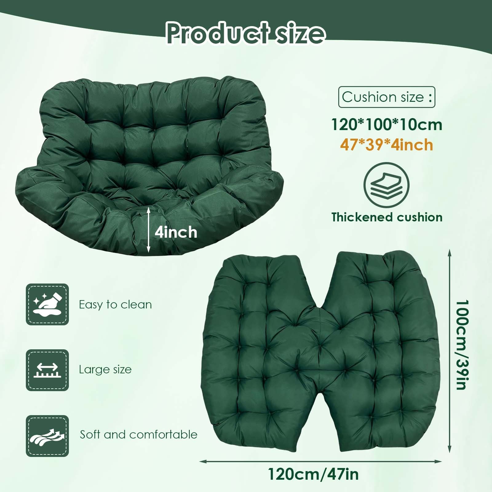 Type: Hammock Chair Cushion Replacement Suitable for: Hammock; Swing Chair; Swing Seat; Papasan chairs Shape: Rectangle Material: High Density Water Resistant Oxford Fabric Filling Material: PP Cotton Weight: 6.2lbs (2.8kg) Size: 44 x 39 x 4 inch (120 x 100 x 10 cm); Thickness: 4 inch Package Included: