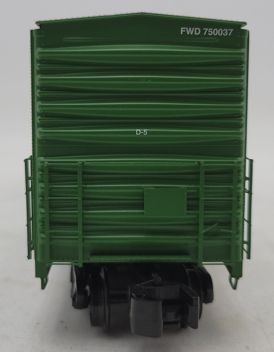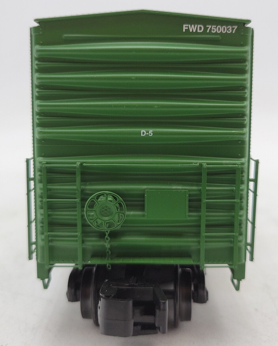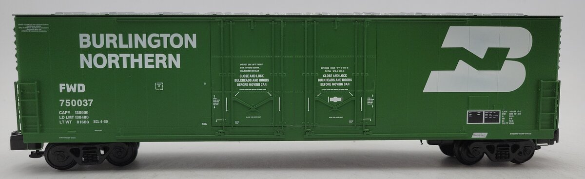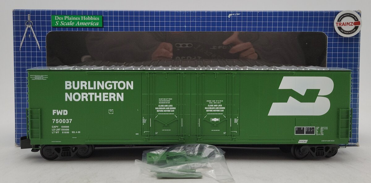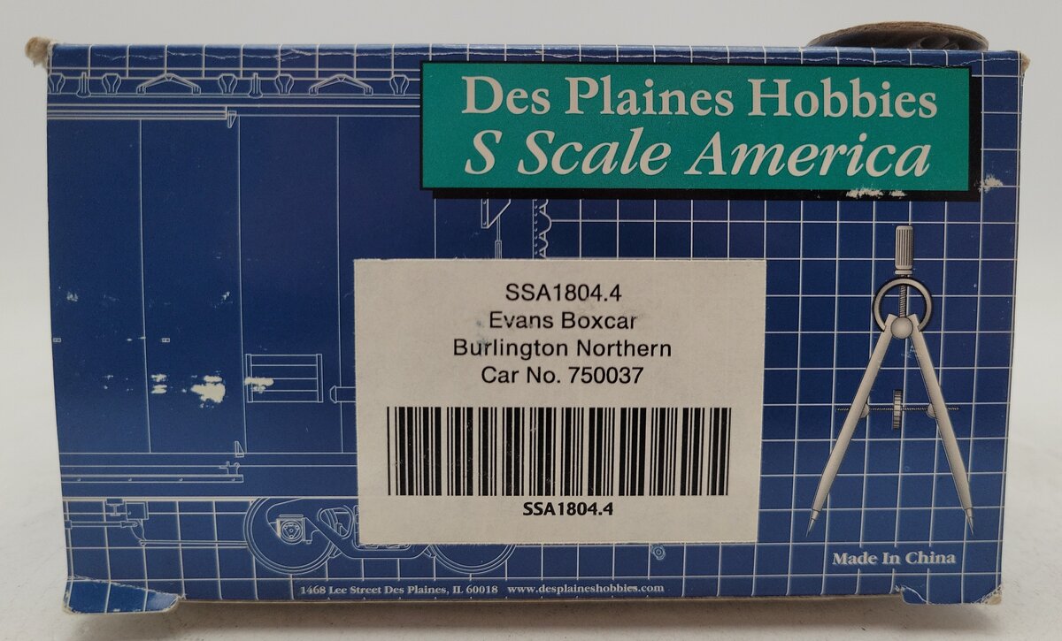 Here is a Des Plaines Hobbies SSA1804.4 S Gauge Burlington Northern Box Car #750037. This car features plastic construction, plastic trucks, metal wheels and axles, and knuckle couplers.