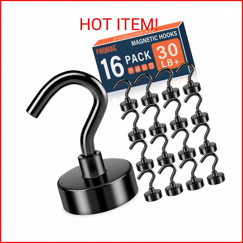 FINDMAG Black Magnetic Hooks, 28lbs Heavy Duty Magnets with Hooks, Strong Cruise Magnets, N52 Neodymium Magnetic Hooks for Cruise Cabins, Travel, Classroom, Office, Kitchen, Fridge, Grill, Pack of 16