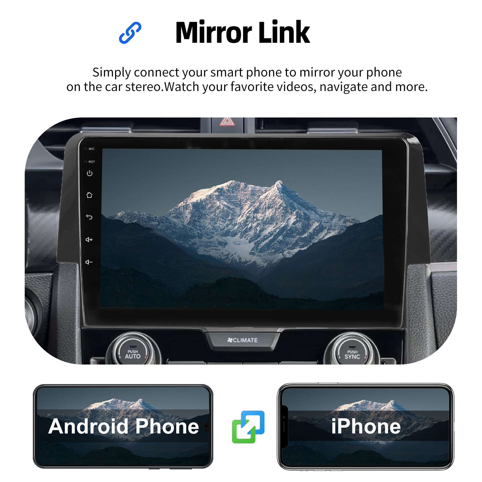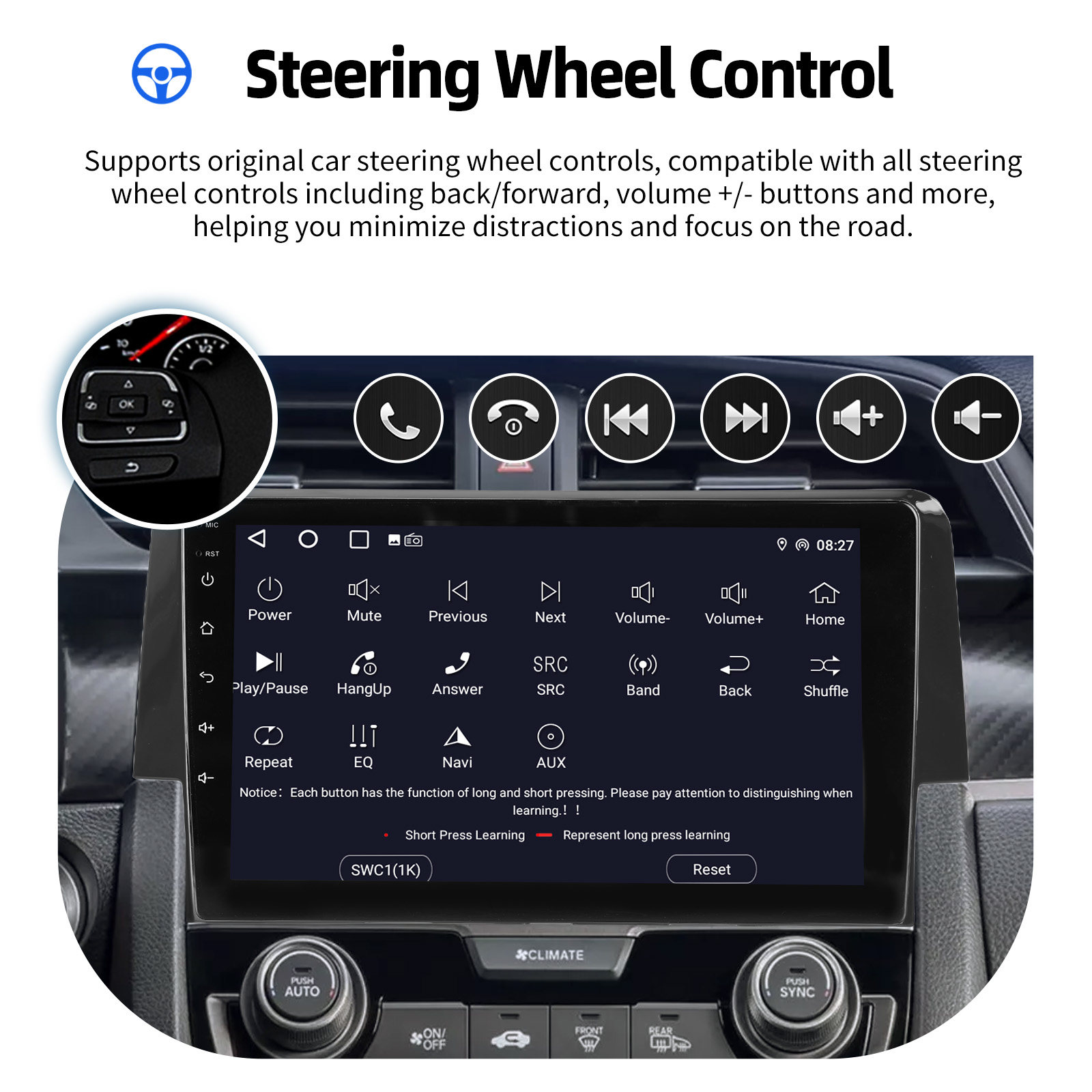 9 Inch Android 14 Car Radio For Honda Civic 2016-2020: The Android car radio with 9" 1280* 720 HD capacitive touchscreen, 2GB RAM and 32GB ROM allows you to download your favorite apps and videos, so driving is no longer boring. No extra frame, no cable change, plug and play. It comes with Canbus and supports most original functions: Steering wheel control, reverse signals and reading original computer data, etc.