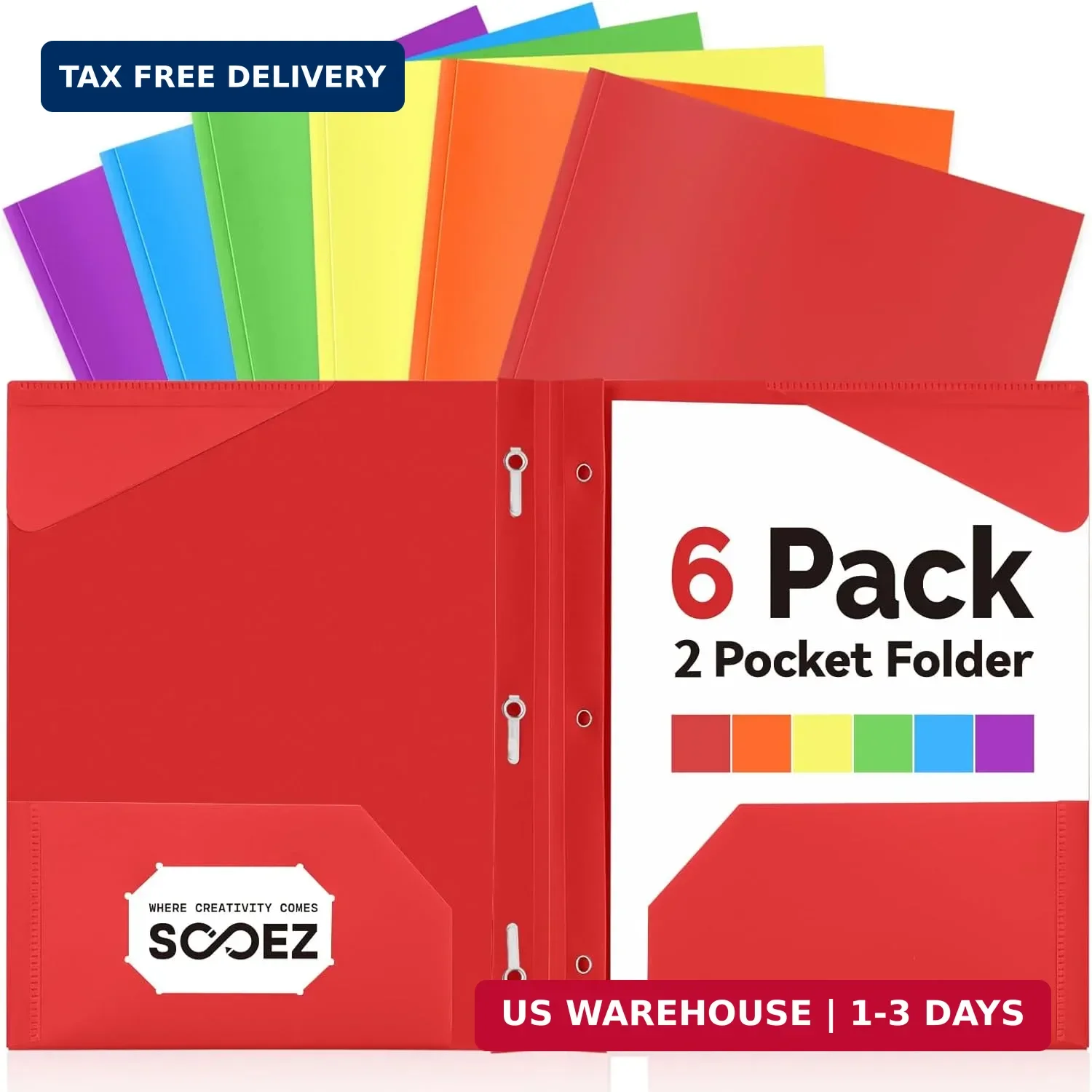 Sooez Plastic Folders with Pockets and Prongs, 6 Pack Pocket Folders with Prongs
