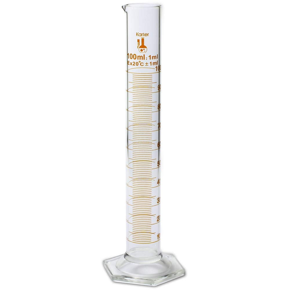 Karter Scientific is a registered trademark in United States of America. To maintain quality control, authorized permission is required in the resale of our products. Karter Scientific cylinders are made of 3.3 Borosilicate glass material for durability, chemical, and temperature resistance. Uniform wall thickness over the entire measurement range, so wedge errors are avoided. Features legible numbers and graduations plus a hexagonal base that prevents rolling. Single Metric Scale, Class B, Spout top with pour out. If you have any questions or concerns, please contact us. We are happy to make it right!