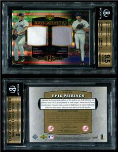 Your buying a Roger Clemens / Randy Johnson 2006 Upper Deck Epic Pairings #CJ BGS 9.5 Pop 2 . I own both of the Gems and will be selling all my dupes as I wonnow down an out of control PC. I'll be listing some of the tougher variations in this series including a bunch of duals and rare patches. You won't find many of these easily most of these are locked away in many PC's of player and set collectors