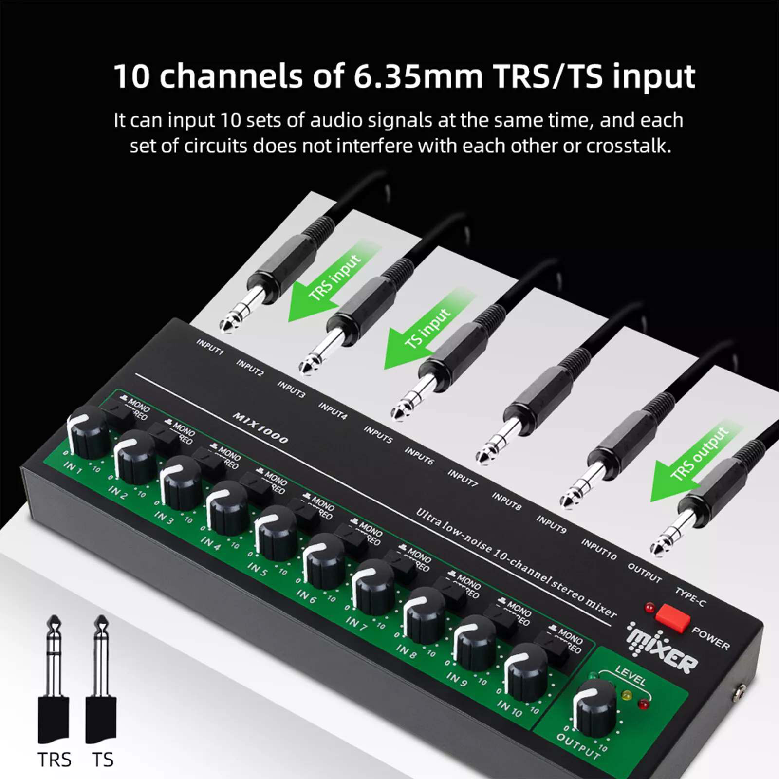 Multichannel audio processing capability: This 10-channel stereo mixer supports 10 6.35mm TRS/TS inputs, allowing 10 sets of audio signals to be entered simultaneously. Each group of circuits operates independently, ensuring that each channel does not interfere with each other, avoiding crosstalk phenomenon, and providing a solid foundation for professional audio processing.