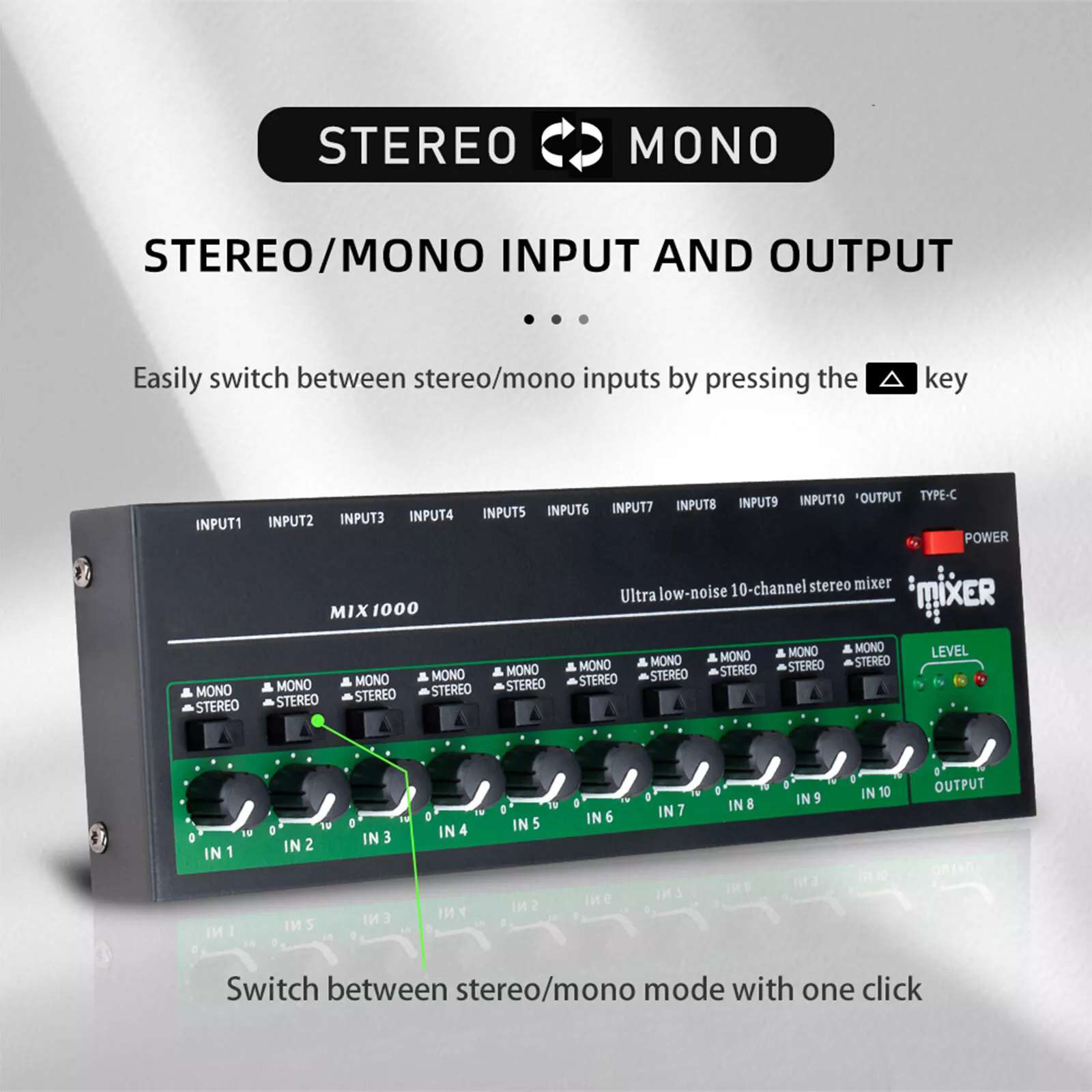 Flexible stereo/mono input/output: Users can easily switch between stereo and mono input modes with a simple push of a button. This feature is designed to be flexible and convenient, and can meet different audio needs, whether it is stereo music playback or mono voice recording, it can be easily handled.