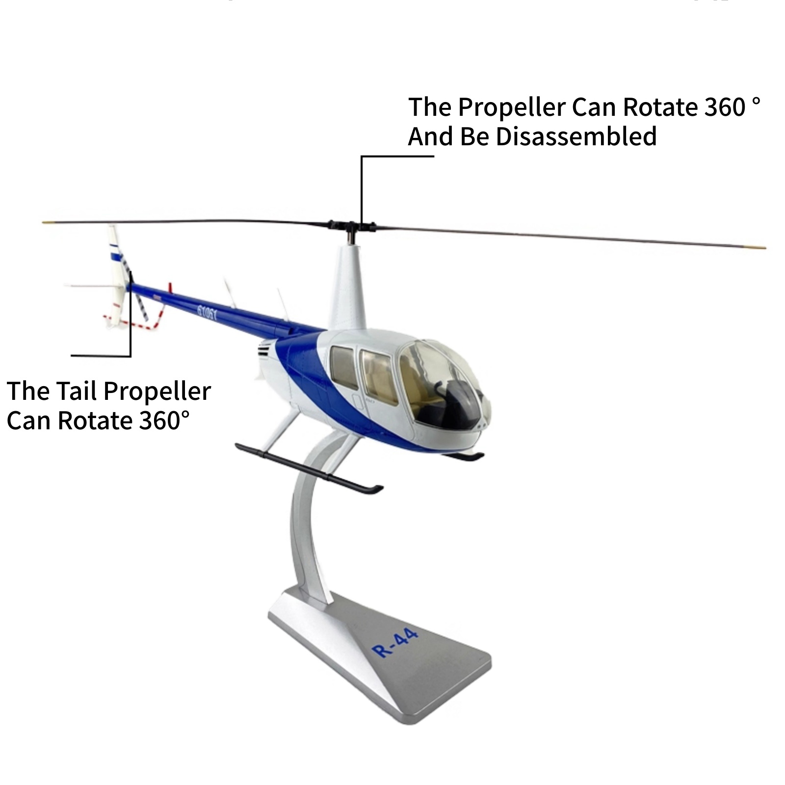 Robinson R44 Is A Four Seater Light Helicopter Produced By Robinson Helicopter Company In The United States. With Its Excellent Performance, High Reliability, And Relatively Low Operating Costs, It Has Become One Of The Best-Selling Light Helicopters Worldwide. The Helicopter Is Equipped With A Lycoming Q-540 Piston Engine, With A Maximum Power Of 260 Horsepower, A Cruising Speed Of 210 Kilometers Per Hour, A Maximum Range Of Approximately 645 Kilometers, And A Maximum Ceiling Of 4270 Meters. It Is Suitable For Use In Flight Training, Aerial Photography, And Aerial Forest Protection. The Robinson R44'S Rotor System Features A Dual Blade Main Rotor And Tail Rotor Design, With Elastic Swing Hinges And A Maintenance Cycle Of Up To 400 Hours; Its Safety Design Includes A Collision Resistant Soft Bladder Fuel Tank To Prevent Leakage And An Optional Emergency Float To Support Water Emergency Landing. Commercial Use For Power Line Patrol: Covering 300 Square Kilometers In A Single Day; Aerial Sightseeing: Comes Standard With Leather Seats And A Sunroof For Viewing; Public Affairs: It Is Commonly Seen In Police Patrols And Medical Rescue Operations. The Success Of R44 Cannot Be Achieved Without A Series Of Thoughtful Designs And Technological Applications. The Lines Of The R44 Body Have Been Optimized, Effectively Reducing Flight Resistance, Which Not Only Brings Higher Cruising Speed But Also Improves Fuel Efficiency. R44 Comes Standard With A Hydraulic Assist System, Which Significantly Reduces The Pilot'S Handling Load, Making The Driving Experience Softer And Smoother, And Effectively Suppressing Vibrations Caused By Mechanical Transmission. Since Its Official Launch In 1996, The Production And Sales Volume Of R44 Have Continued To Grow. As Of May 2001, Its Total Production Had Exceeded 1200 Aircraft And It Remains The Best-Selling Piston Helicopter In The World To This Day. It Has Won A Reputation In The Industry For "Low Price, High Standards, And High Performance", Greatly Reducing The Threshold For Purchasing And Operating Light Helicopters While Ensuring Quality And Safety.