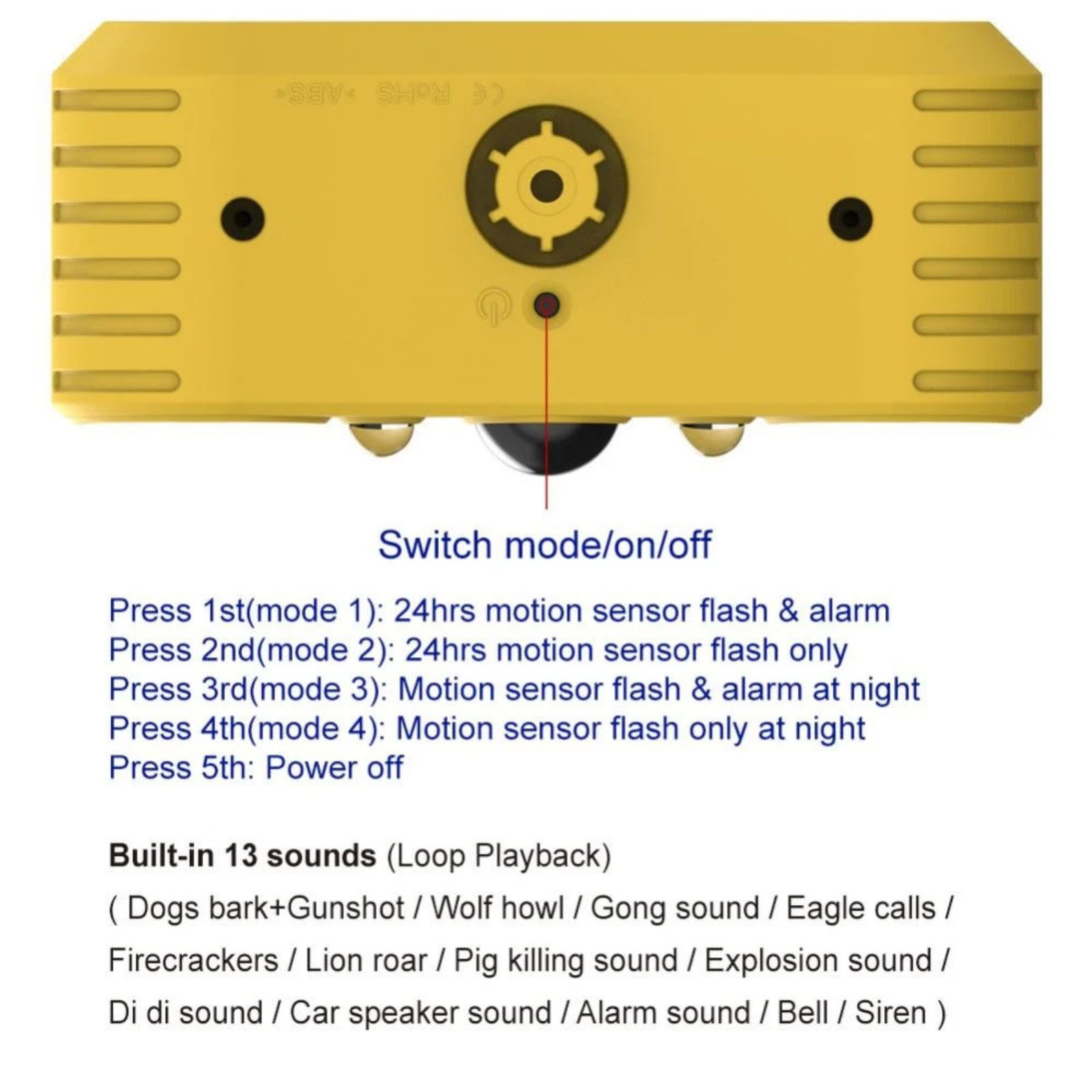 Versatile Working Modes: Our solar alarm system offers 4 working modes, giving you the flexibility to tailor the alarm's response to your specific needs: mode 1: 24-hour motion detection with 13 sounds and red-blue flashing lights; mode 2: 24-hour motion detection with red-blue flashing lights only; mode 3: Motion detection with 13 sounds and red-blue flashing lights, activated only at night; mode 4: Motion detection with red-blue flashing lights, activated only at night.