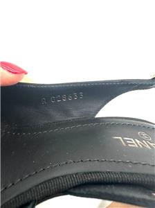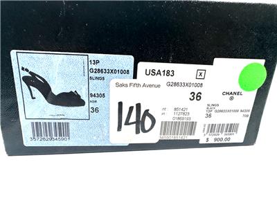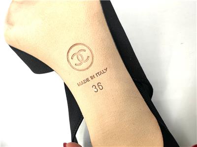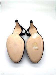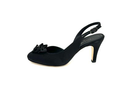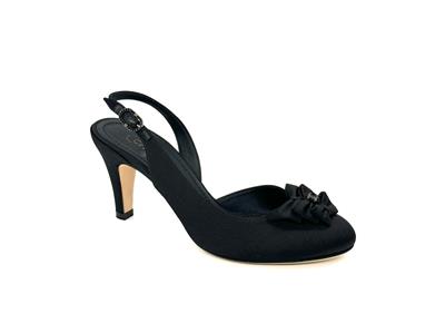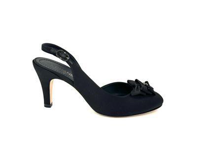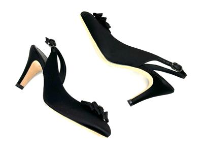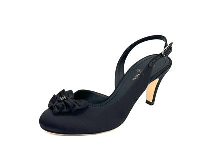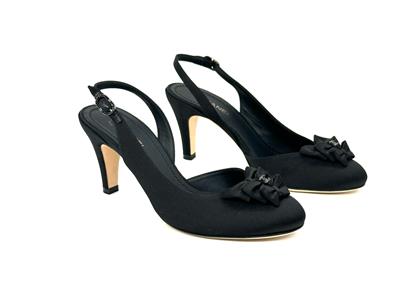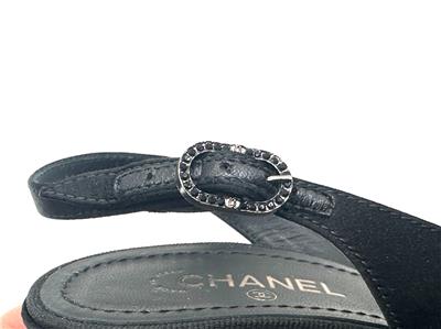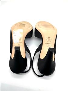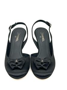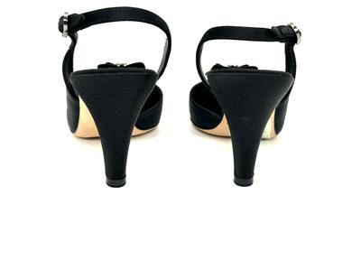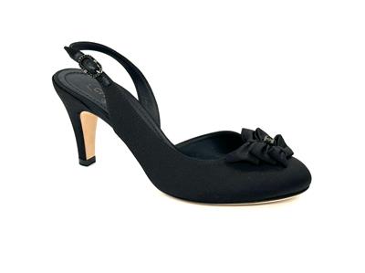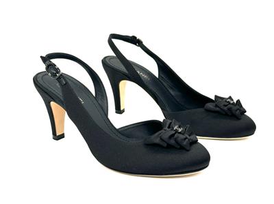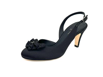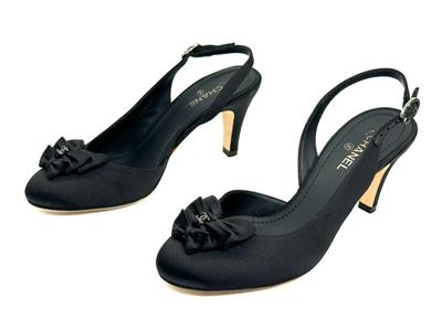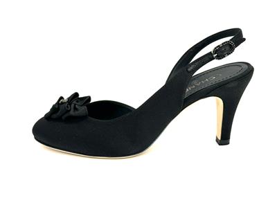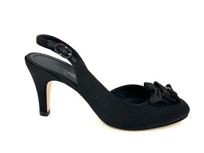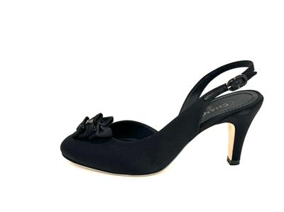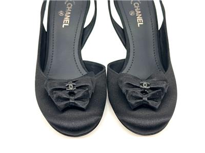 Black satin slingback with tripple satin bows at the front adorned with rhinestone embellished CC logo. Ankle strap with rhinestone covered buckle. Selfcovered heel measures 3". Padded leather insole and leather sole. Made in Italy.
