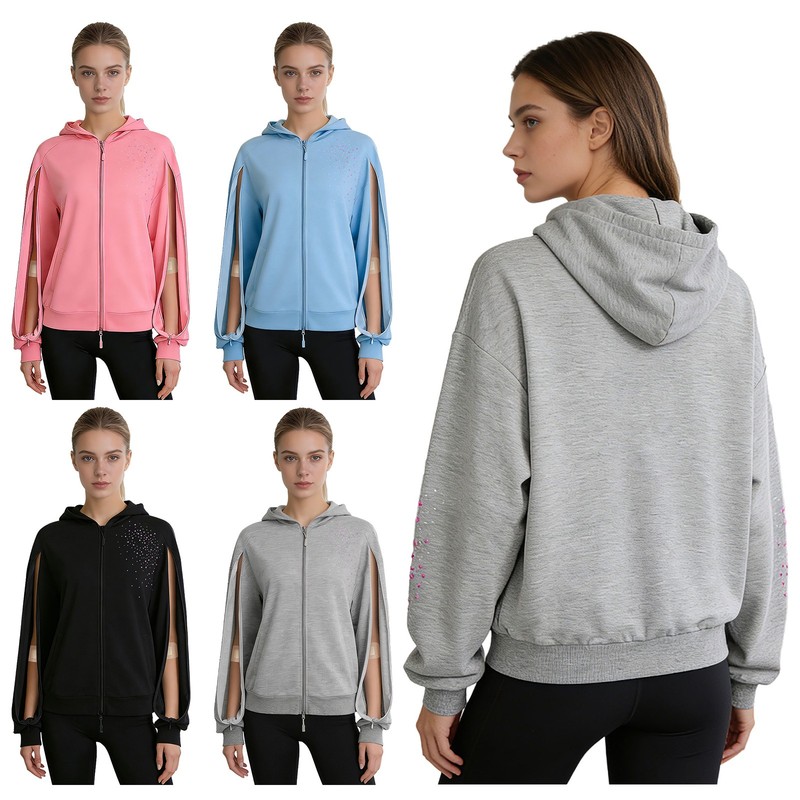Shiny rhinestones adorn the sweatshirt, bringing a bit of sparkle and glamour, perfect for those who want to make a fashion statement.
