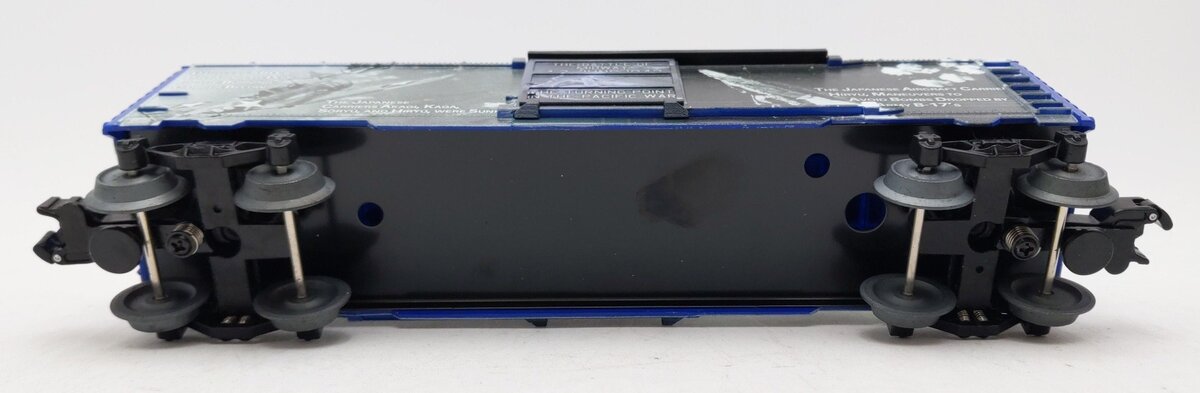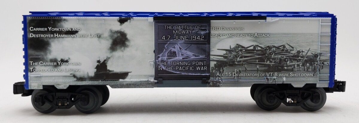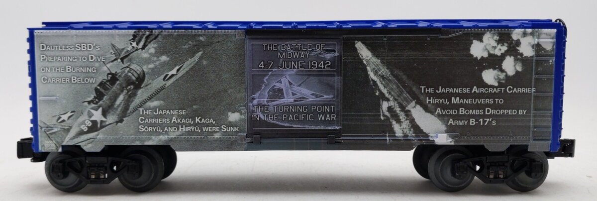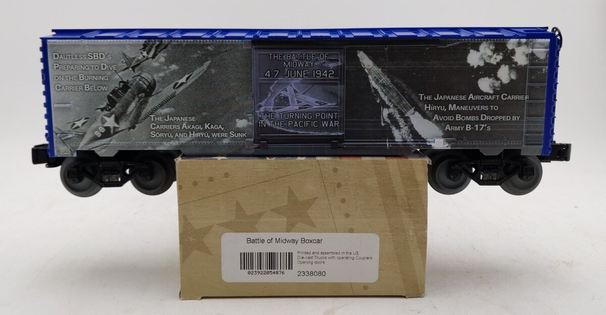 This is a Lionel 2338080 O Battle of Midway Boxcar. Features: Printed and assembled in the USA. Die-cast metal sprung trucks. Operating couplers. Metal frame. Opening doors.
