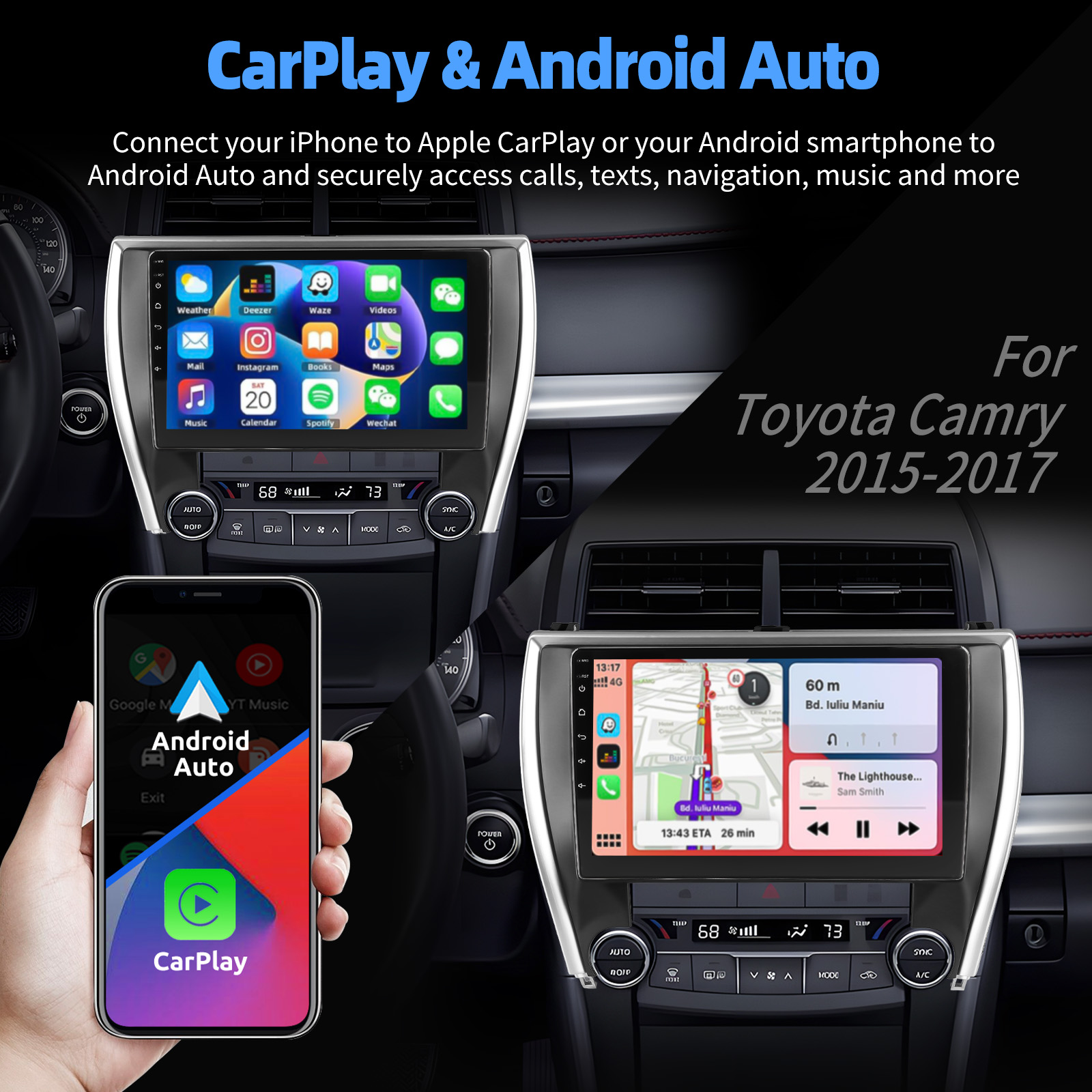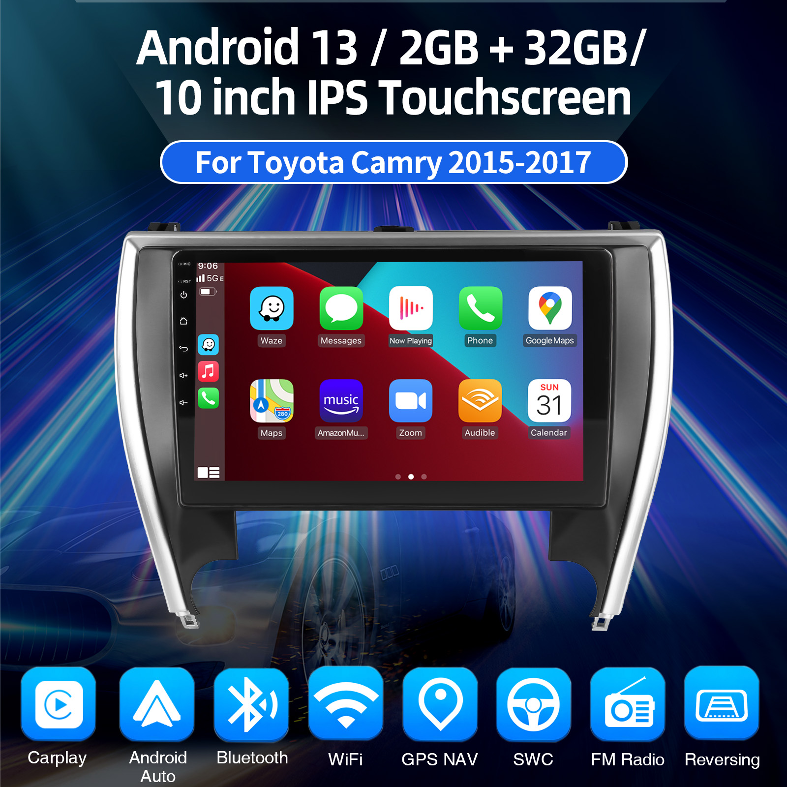 10.1 Inch Android 13 Car Radio For Toyota Camry 2015-2017: The Android car radio with 10.1" 1280* 720 HD capacitive touchscreen, 2GB RAM and 32GB ROM allows you to download your favorite apps and videos, so driving is no longer boring. No extra frame, no cable change, plug and play.
