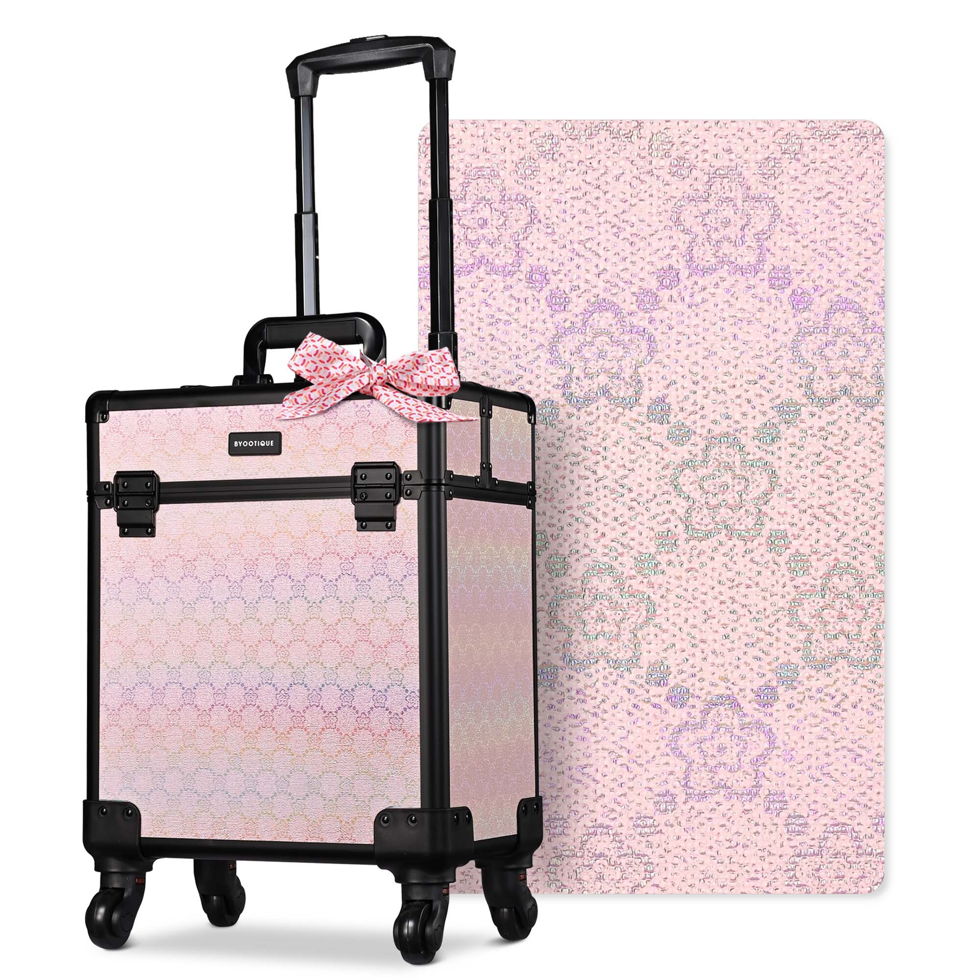 - Blush ForgetMeNot - Byootique Rolling Makeup Train Case boasts its iridescent pink shade with forget-me-not flower design, a charming symbol of enduring love, devotion and loyalty, and the pink shade create a mesmerizing dance of color with hints of blush and coral, evoking a sense of playfulness and romance