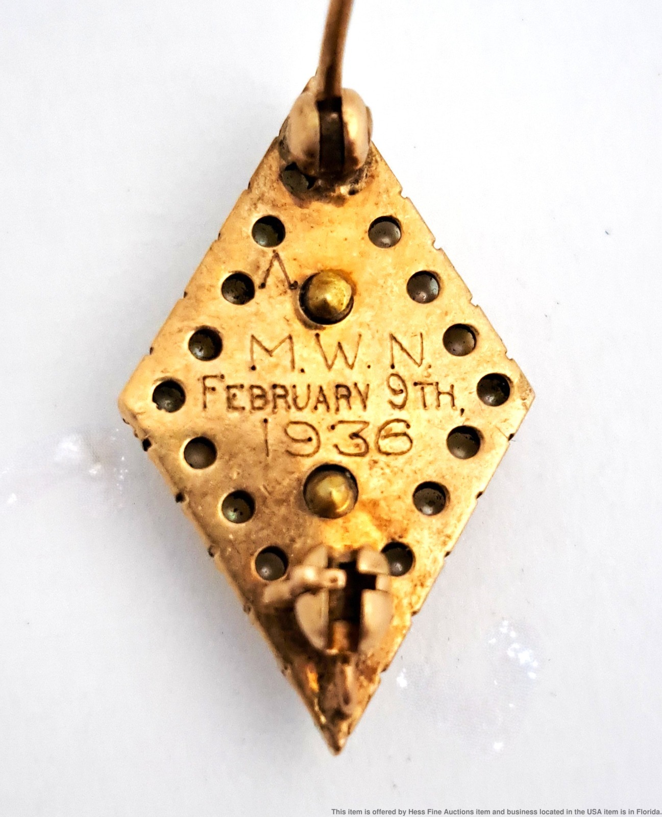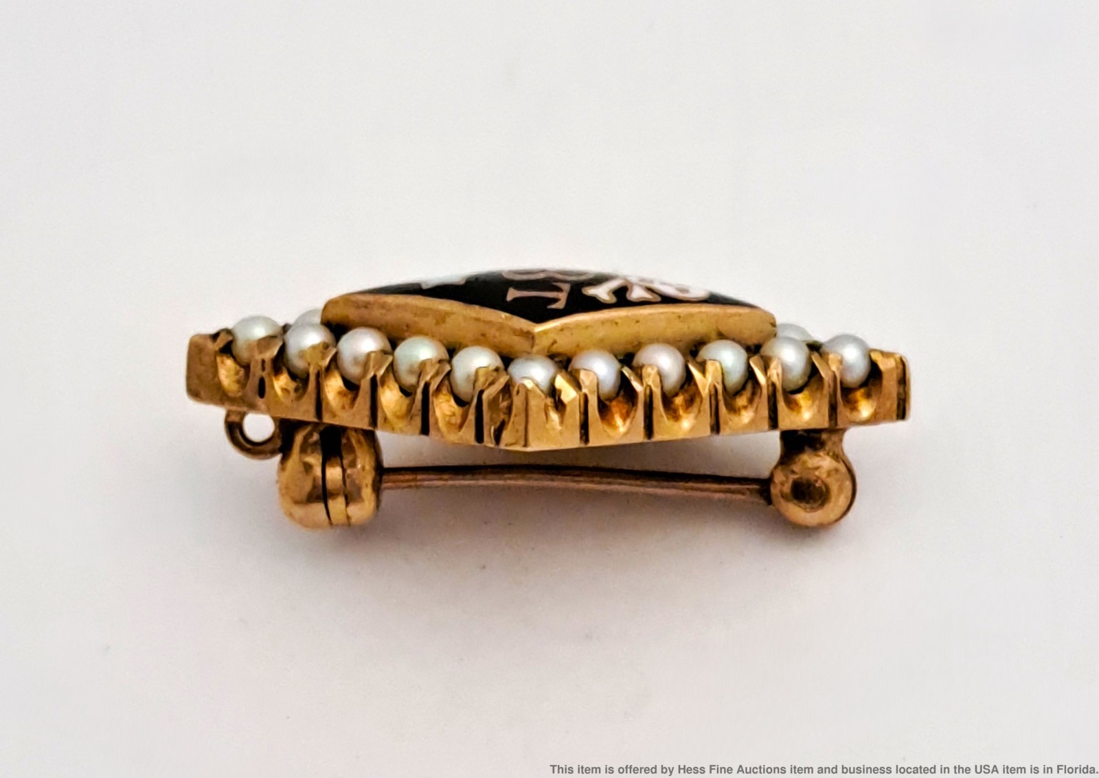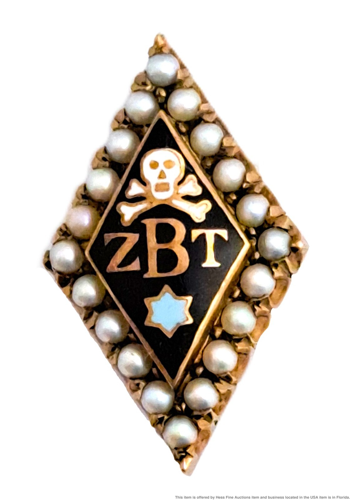 - Described & Photographed By: Rafe HFA NFED 70910A Title: Vintage Pearl 10k Gold Fraternity Pin Zeta Beta Tau Black Enamel Skull and Crossbones Description: Vintage Pearl 10k Gold Fraternity Pin Zeta Beta Tau Black Enamel Skull and Crossbones Here are the specifications: Type of Jewelry: Pin Gemstones: Pearls Approx. Measurement or Weight of Gemstones: 1.6mm Pearls Mounting metal: 10k Approx. Size or length: 21x13x7mm Condition: The piece is intact and secured with minimal wear on the back Stamping or Factory Markings: A MWN February 9th 1936 Total weight of piece: 3.5g Estimated size of package: 7x5x3 Total Weight of Package: 8 oz