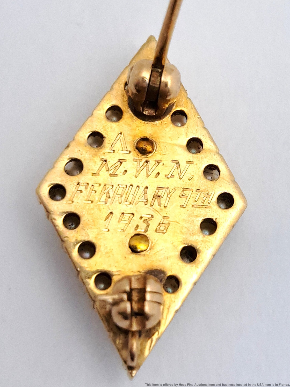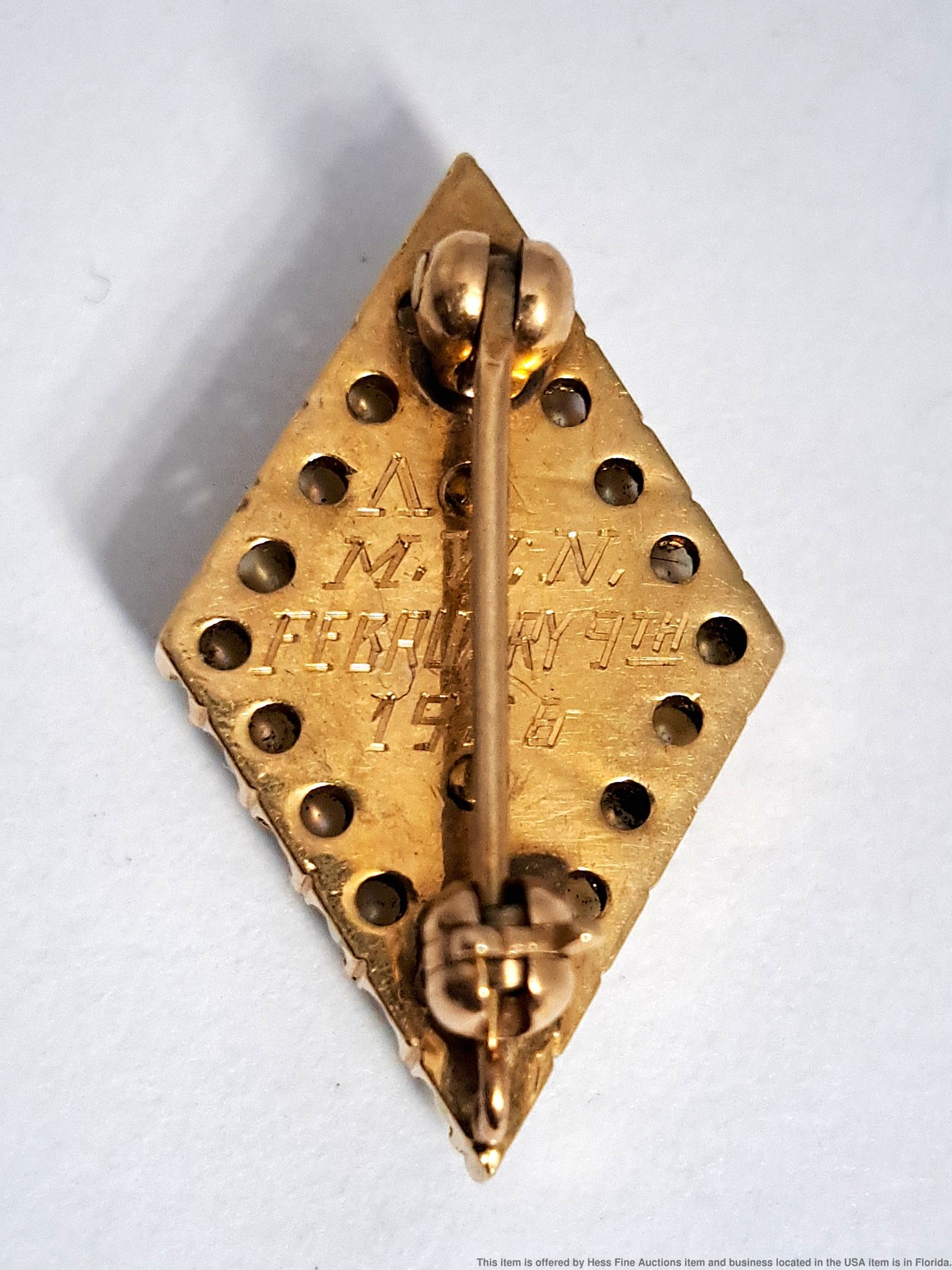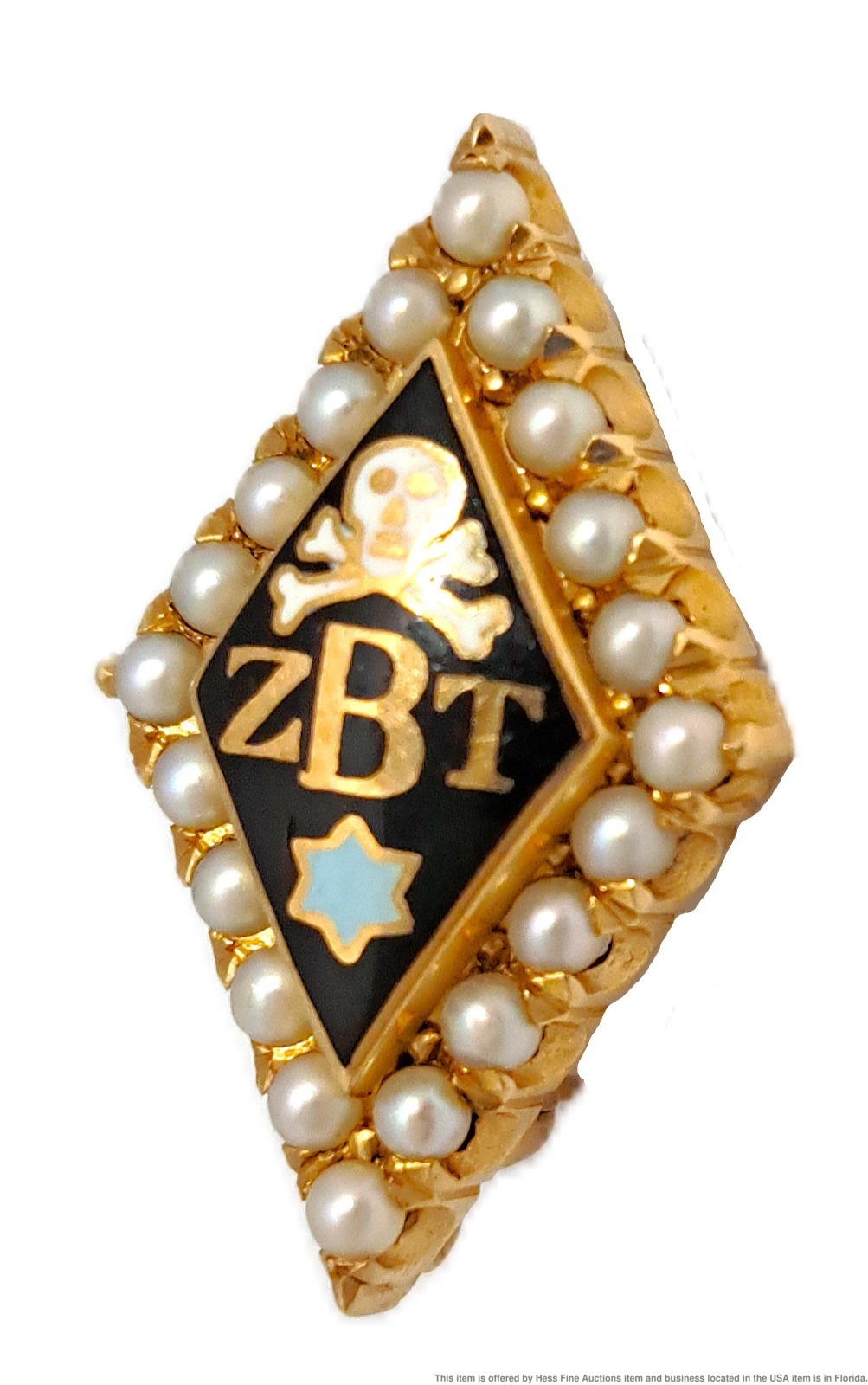 - Described & Photographed By: Rafe HFA NFED 70910B Title: Vintage Pearl 10k Gold Pearl Enamel Fraternity Pin Zeta Beta Tau Skull and Crossbones Description: Vintage Pearl 10k Gold Pearl Enamel Fraternity Pin Zeta Beta Tau Skull and Crossbones Here are the specifications: Type of Jewelry: Pin Gemstones: Pearls Approx. Measurement or Weight of Gemstones: 1.6mm Pearls Mounting metal: 10k Approx. Size or length: 21x13x7mm Condition: The piece is intact and secured with minimal wear on the back Stamping or Factory Markings: A MWN February 9th 1936 Total weight of piece: 3.5g Estimated size of package: 7x5x3 Total Weight of Package: 8 oz