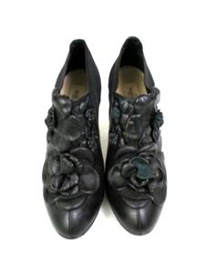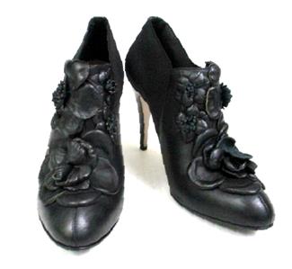VALENTINO GARAVANI BLACK LEATHER & ELASTIC SLIP ON BOOTIES WITH FLORAL APPLIQUES, APPROX. 4.25" COVERED HEELS, LEATHER INSOLES, LUGGED TOE SOLES. MADE IN ITALY