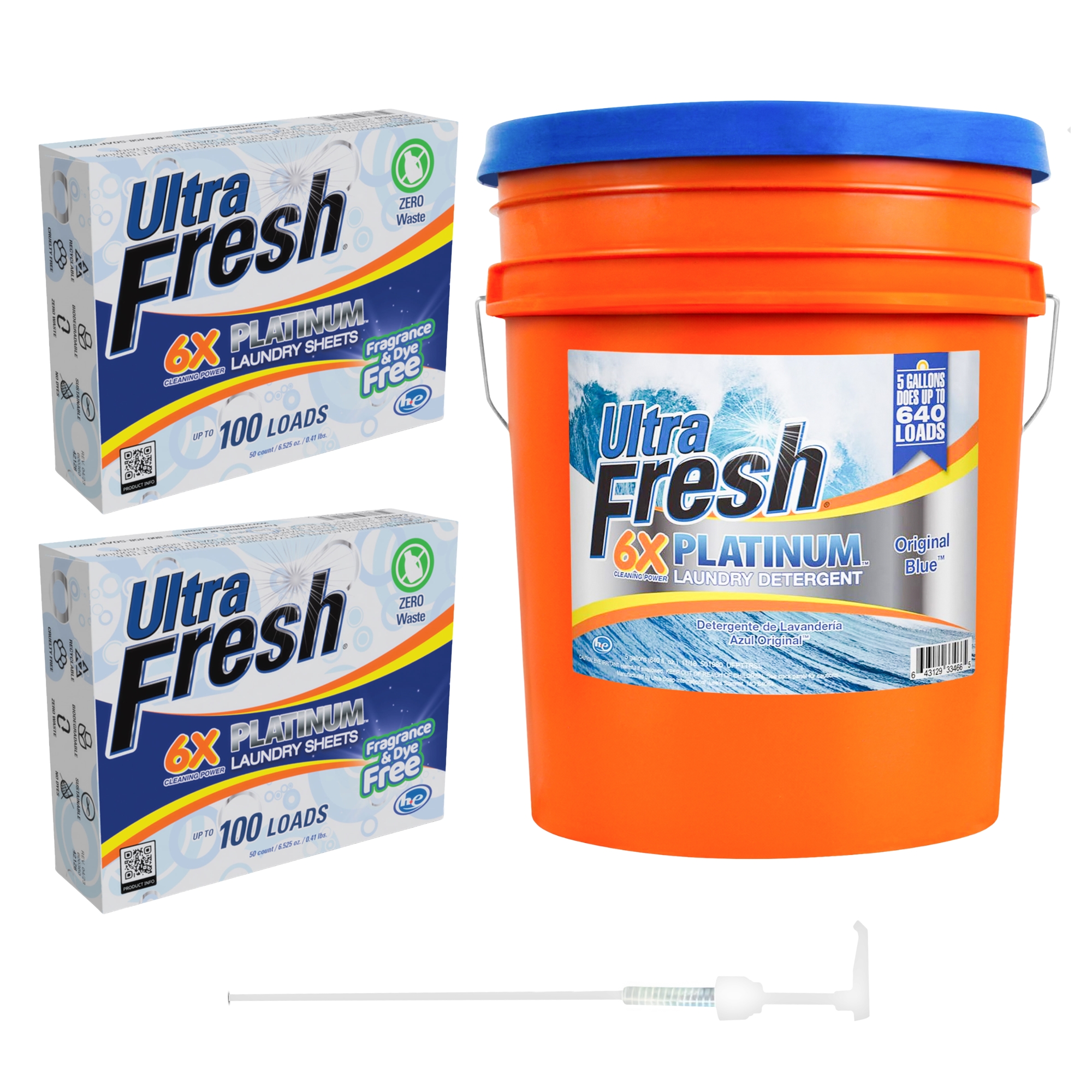 Upgrade your laundry routine with the powerful and versatile Ultra Fresh 6X Platinum 5-Gallon Original Blue Liquid Detergent bundled with the 2 pack of Platinum 6X Laundry Detergent Sheets with Fragrance and Dye Free, combining advanced liquid detergent performance with eco-friendly detergent sheet convenience for a complete cleaning solution. Designed to deliver exceptional results, this detergent offers deep-cleaning power, long-lasting freshness, and flexible options to suit every household need.