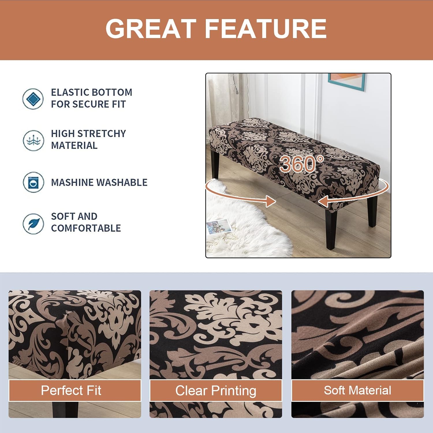 High Quality Bench Cover:This Bench Cover made of 92% polyester and 8%spandex.Soft material,fortable and wrinkle resistant,no ironing required.Stretchable Material,stretch that recovers quily,se fit with sewn-in elastic hem.hine washable,easy to cleaning and wash. High-grade fabrics makes the bench cover durable,wrinkle-resistant,anti-pilling,soft and fortable.