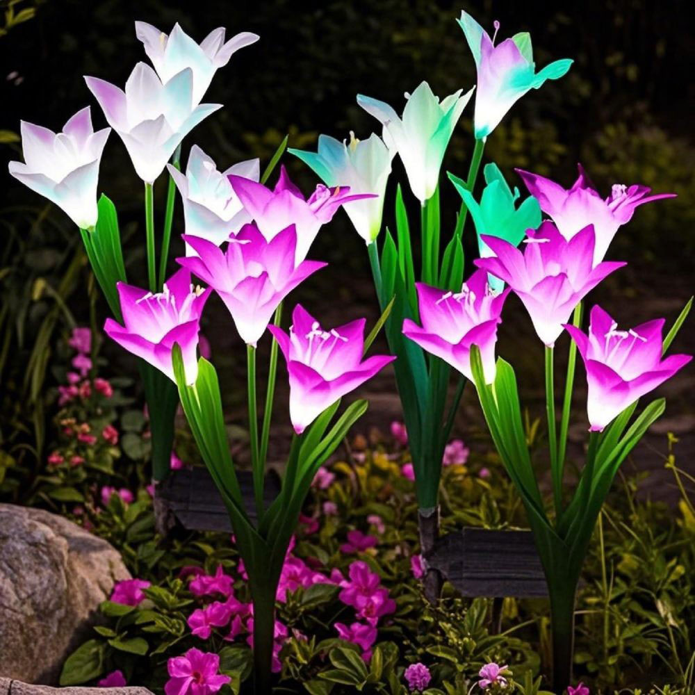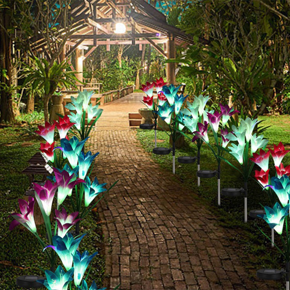 2 Pack Solar Flowers: Bigger lily flowers are now of better fabric, achieving more realistic appearance and size to real flowers. Adjustable stems and leaves can easily be bent into different angle and style for your different demands.