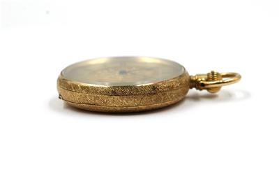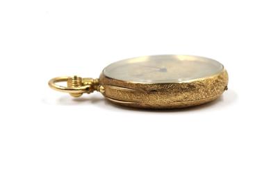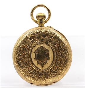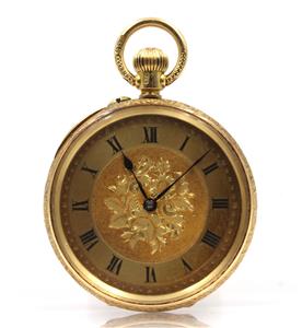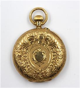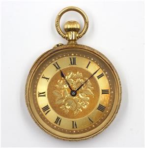 Case- The 18K solid gold ladies case has a beautiful floral design on the back. The case measures approximately 33.4mm across. The total weight of the case and movement is 27 grams. It is gorgeous for it's age.