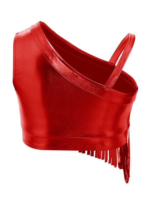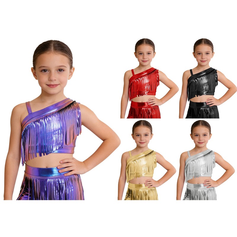 Metallic tassels adorn the crop top, creating a sparkly effect that shines under the stage lights.