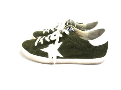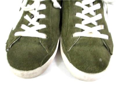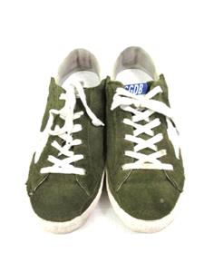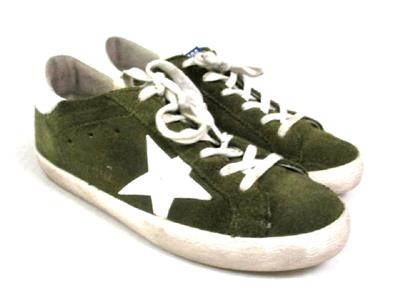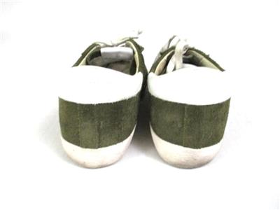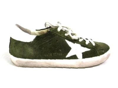 AUTHENTIC GOLDEN GOOSE SUPERSTAR OLIVE GREEN SUEDE & DISTRESSED LEATHER LOW TOP SNEAKERS WITH LACE UP FRONT, STAR ACCENT, LOGO AT TONGUE & PADDED HEEL, RUBBER SOLES, LEATHER LINING & INSOLES.