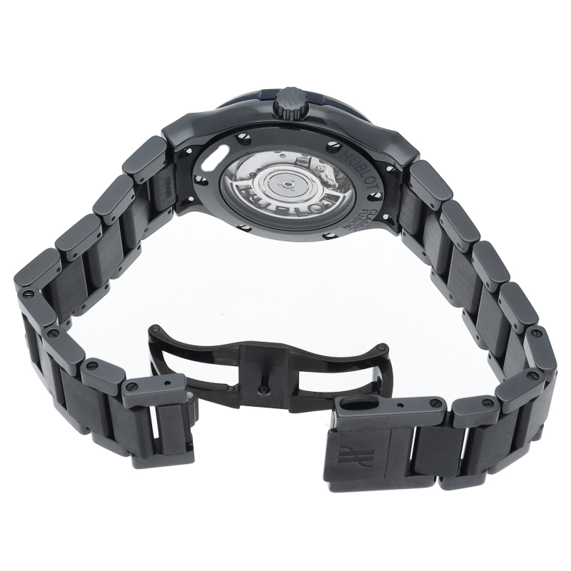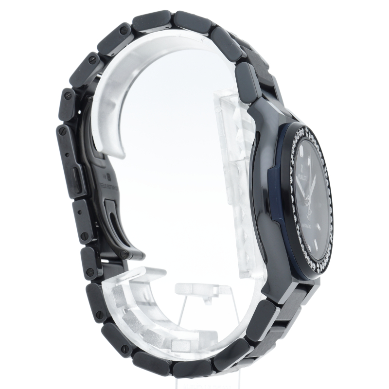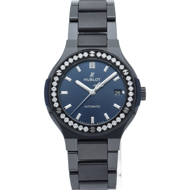 | The Hublot Classic Fusion is a Mechanical Automatic model featuring a scratch-resistant 1.5" black ceramic case, a beautiful blue dial, and a sparkling genuine diamond bezel. Its urban and sophisticated design makes it suitable for both men and women. Highly sought after in the pre-owned market, this is a superb timepiece highly recommended for those seeking ultimate luxury. |