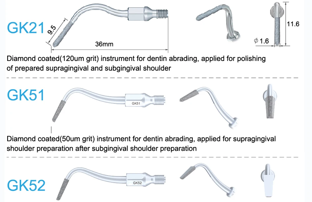 GK21: Diamond coated(120um grit) instrument for dentin abrading, applied for polishing of prepared supragingival and subgingival shoulder