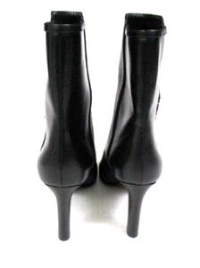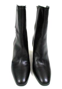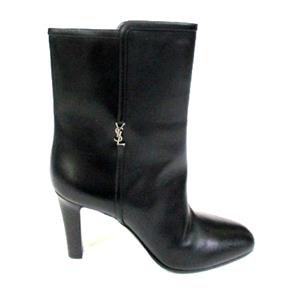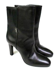 FABULOUS SAINT LAURENT PARIS BLACK SMOOTH LEATHER JANE BOOTIES WITH PULL-ON STYLING, SQUARE TOES, SILVER TONE LOGO PLAQUE, APPROX. 3.75" STACKED HEELS. MADE IN ITALY
