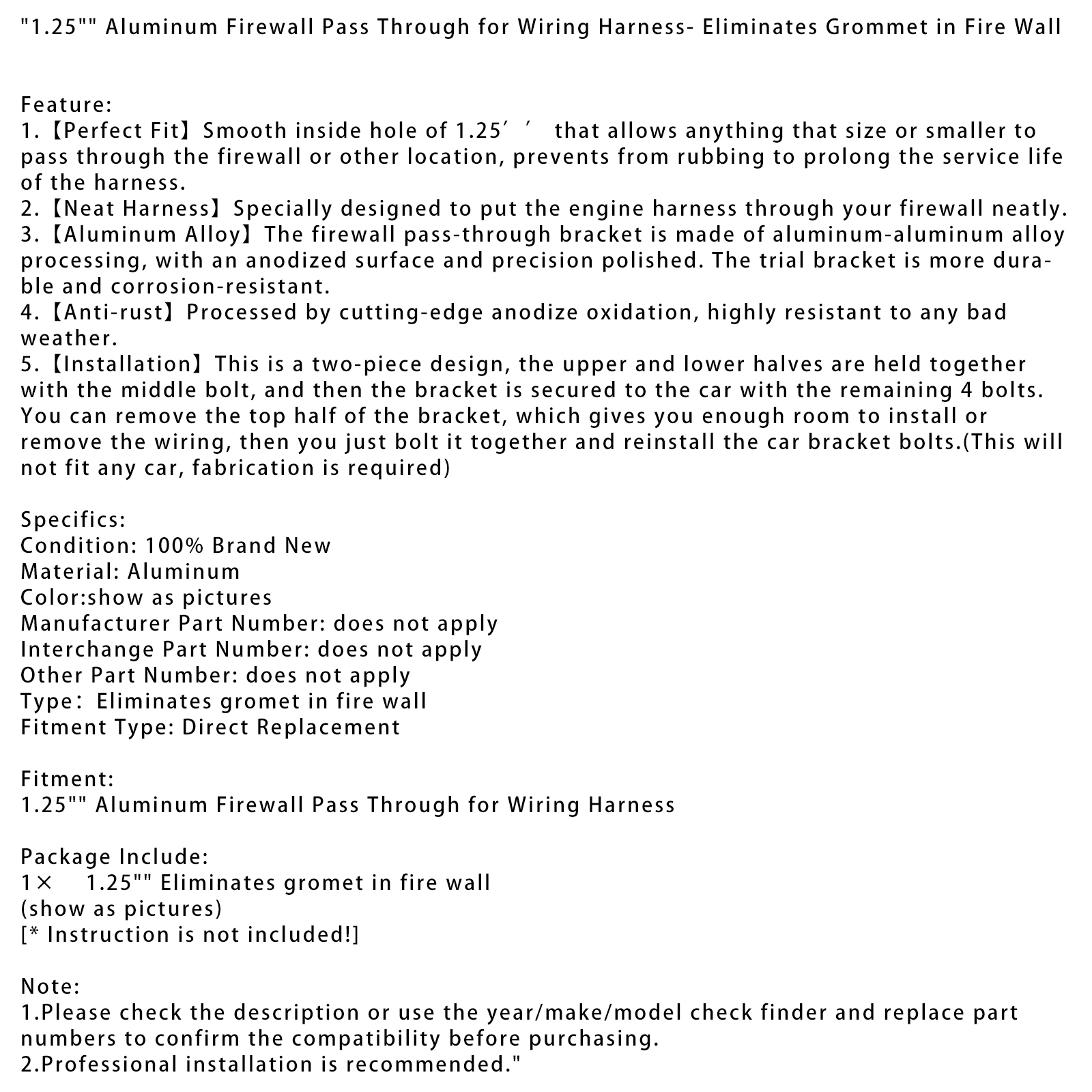 1.【Perfect Fit】Smooth inside hole of 1.25’’ that allows anything that size or smaller to pass through the firewall or other location, prevents from rubbing to prolong the service life of the harness.