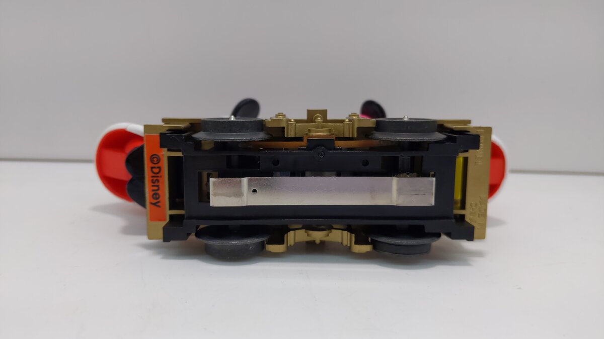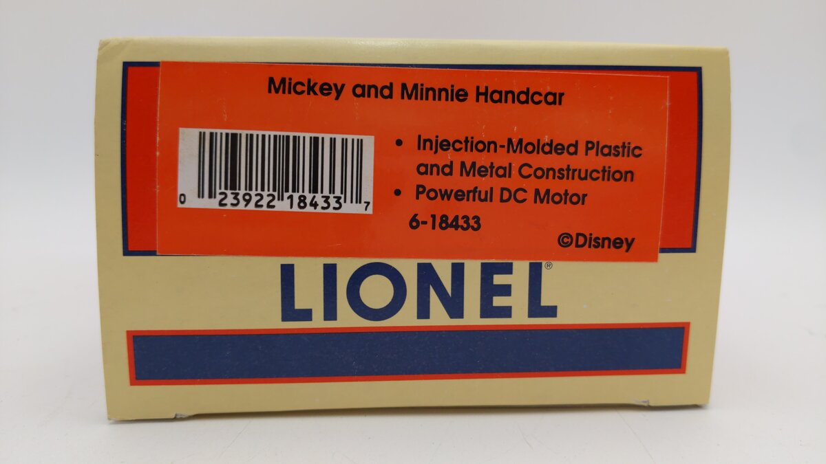 Here is a Lionel 18433 O Gauge Mickey & Minnie Christmas Operating Handcar. It features a DC motor that runs on AC or DC power, articulated Mickey & Minnie figures, and metal wheels and axles. Mickey & Minnie pump the handle as it runs around the track.
