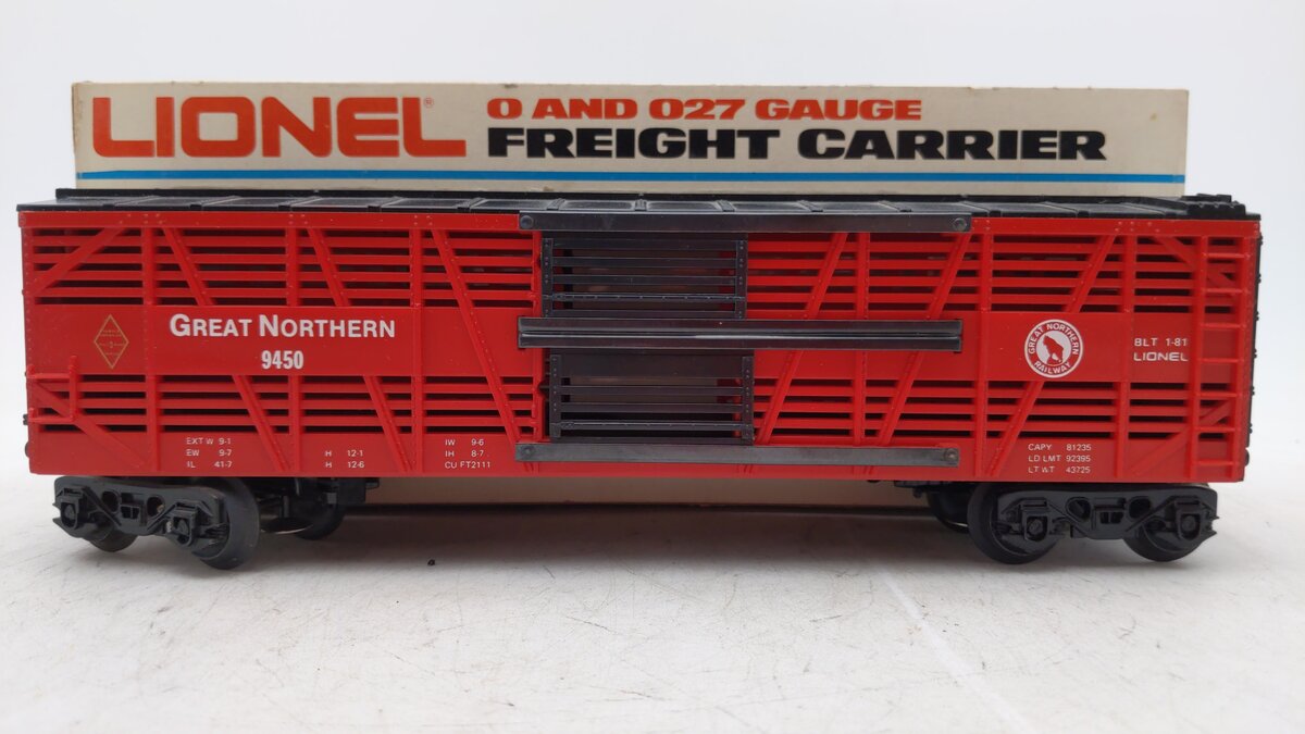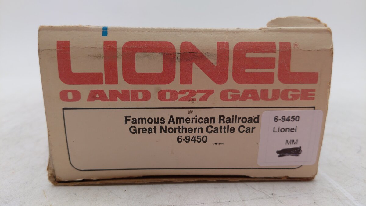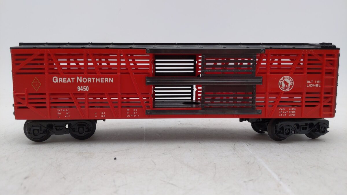 Here is a Lionel 6-9450 O Gauge Great Northern Cattle Car. Features include durable plastic construction, metal frame, sliding doors, operating knuckle couplers, plastic trucks and metal wheels and axles.