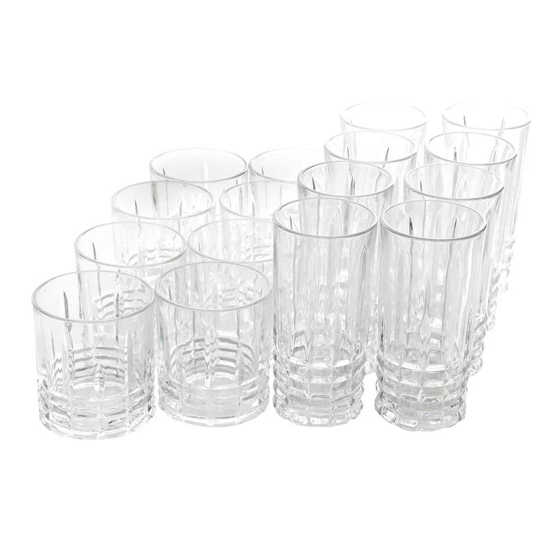 Set includes: Eight 16 oz Tumblers and Eight 11 oz Double Old Fashioned glasses