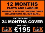 All our cars come with a free 12 months parts & labour warranty & free 12 months AA breakdown cover. The warranty cover is nationwide (any garage can carry out the repairs to the vehicle) with the highest level cover of £1000 per claim (standard industry cover level is only £250) with unlimited claims and with no mileage restriction. We can extend the cover to 2 years for only £195.