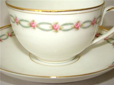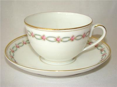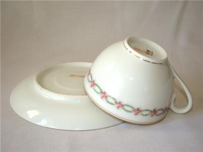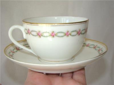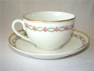 Lovely old fine bone china semi-translucent porcelain teacup and saucer set - cup measures about 2-1/4" tall by 3-1/2" wide and saucer measures 5-5/8" wide. Featuring a low, rounded shape to the cup with applied handle, both pieces are hand decorated in a dainty pink roses and fine leaf chain design with accenting in gold around the edges and handle. Bearing the KPM MADE IN GERMANY stamp, condition is lovely with no chips, cracks, hairlines, repairs, discoloration or damage. A dainty, beautiful teacup set - wonderful addition to any home, table, collection or display!