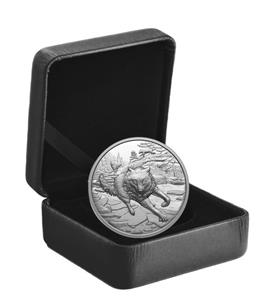 Teamwork, persistence and adaptability—these are the traits that assure a wolf pack's survival, and they have helped cement the grey wolf's reputation as one of the great hunters. Unlike ambush predators such as the cougar, the grey wolf is a pursuit predator, capable of chasing its prey over long distances and adjusting its tactics as circumstances change. The hunt itself is a coordinated group effort, as illustrated from the prey's perspective on this coin, with each pack member contributing to a common goal—an inspiring example of the complexity and wonder of the Canadian wilderness.