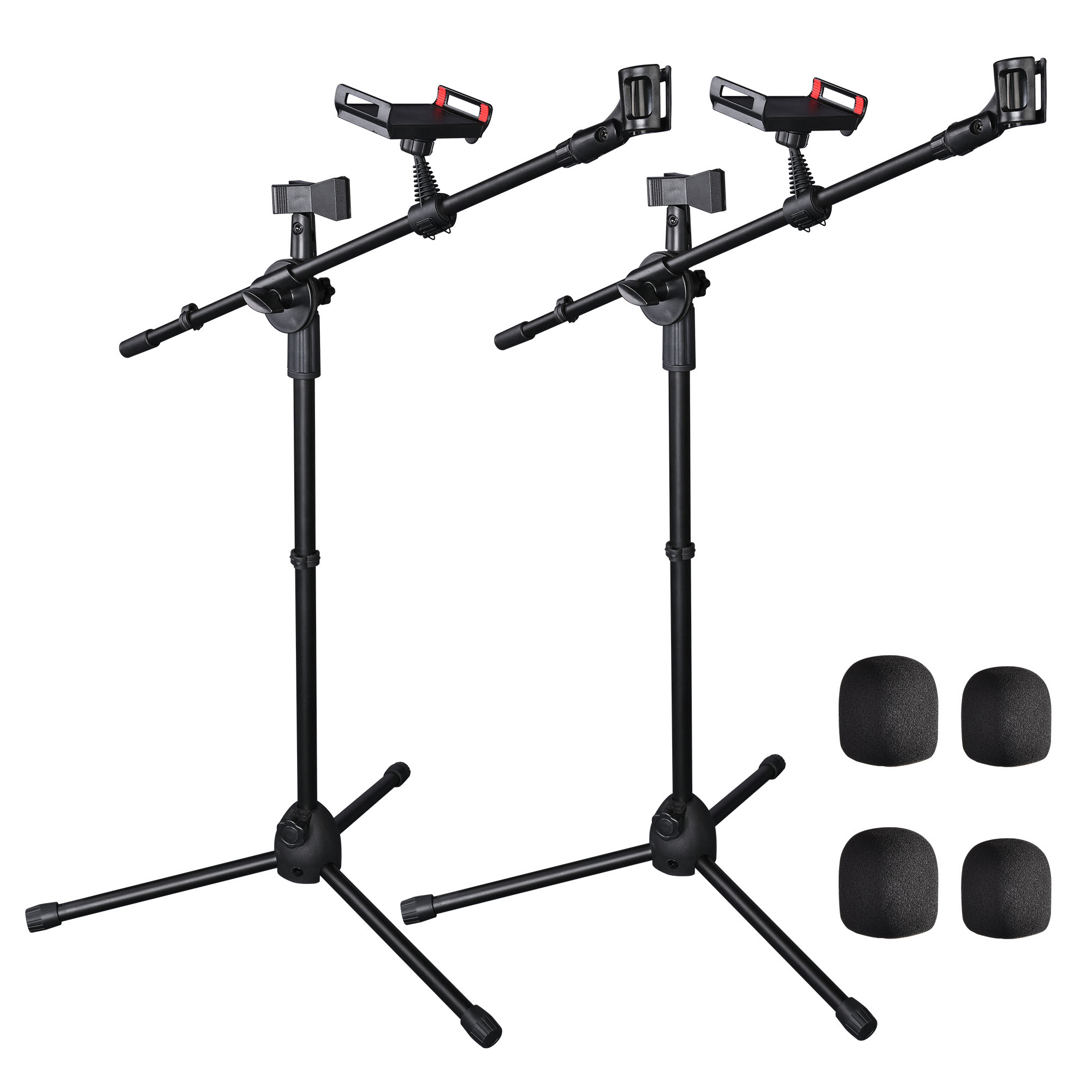 2 Packs of Floor-stand Design Microphone Tripod Stand feature 31" to 53" adjustable height and 360-degree rotatable boom arm for fitting different standing or sitting positions on stage or in studio. Each microphone stand comes with 2 mic clips for most handheld microphones and a phone holder for mounting phones with 4 7/16" to 7 5/16" width.